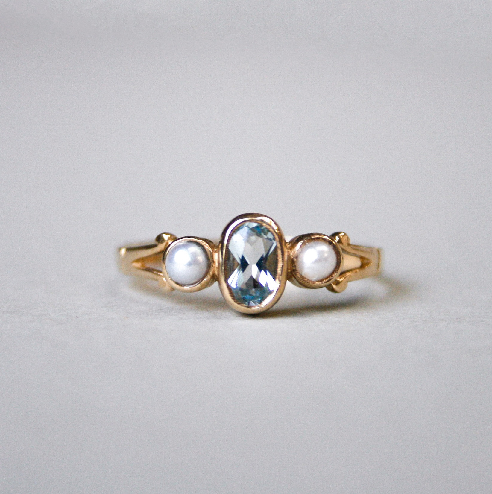 A very pretty and sweet 9ct gold ring set with a central oval cut aquamarine. The aquamarine is a beautiful light sea blue hue and measures 4 mm x 6 mm. Flanked by two creamy white half pearls. One pearl has a very small chip to the nacre, this does not detract from the overall beauty of the piece in my opinion. The ring face measures 13 mm at widest. On a plain shank.