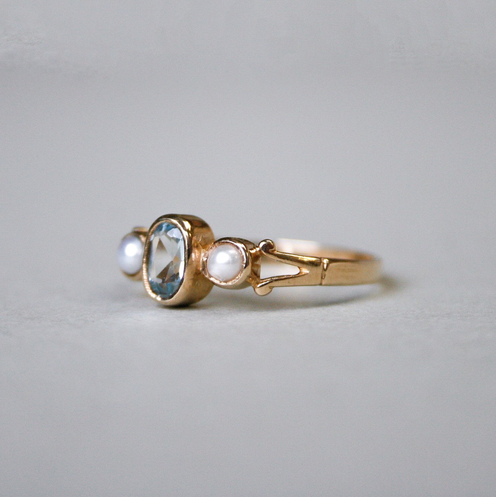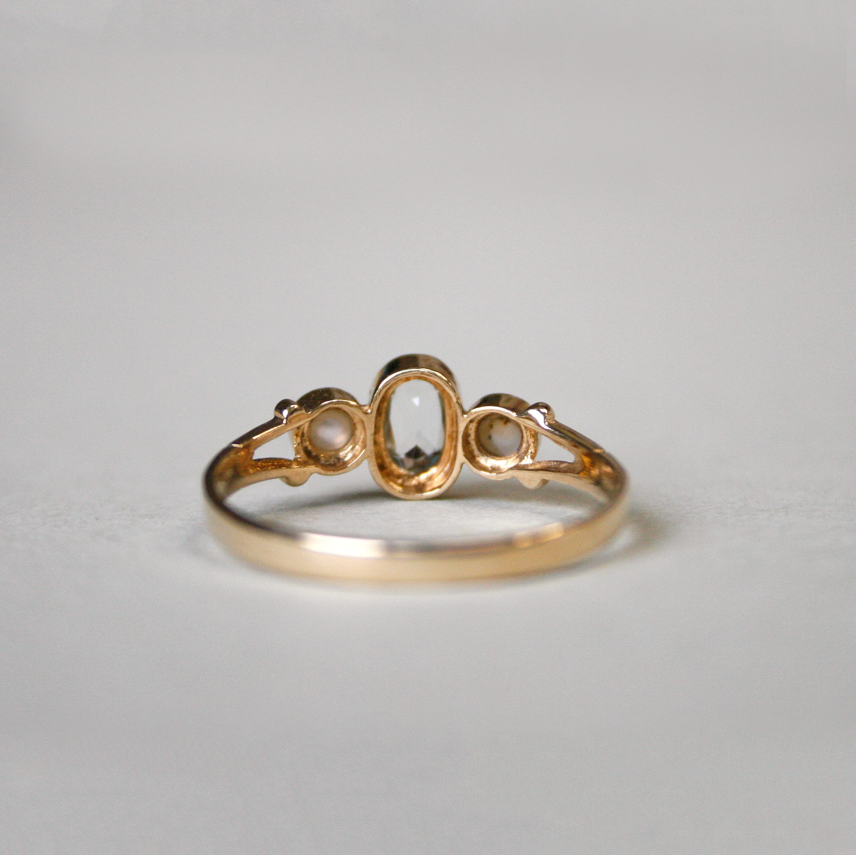 Cutie 9ct gold aquamarine and pearl three stone ring