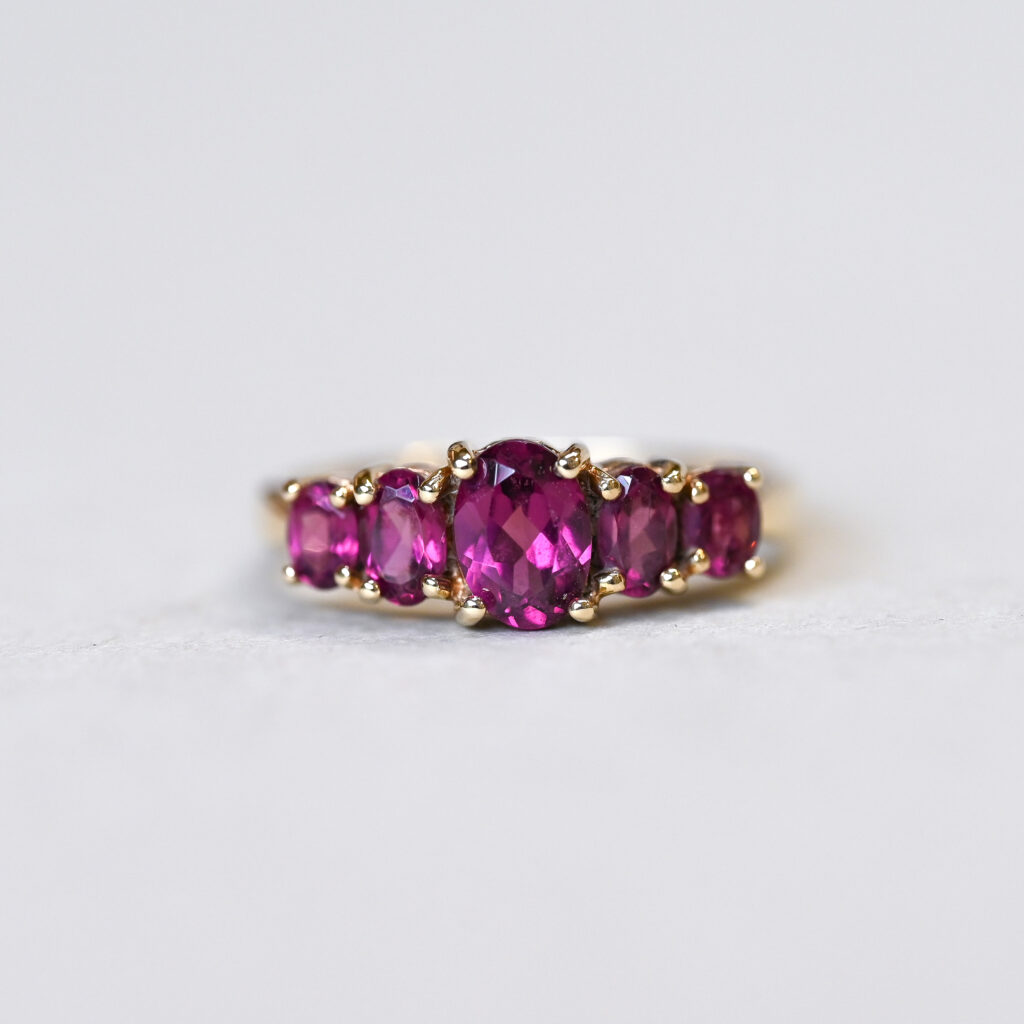 Classic 9ct gold purplish garnet five stone ring