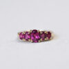 A beautiful, classically designed 9ct gold ring claw set with a central oval shape ruby. The ruby measures 6 mm x 4 mm and is a rich and gorgeously saturated raspberry hue. Flanked by two round, bright, white and very lively diamonds. Each diamond is estimated to be 10 points, totalling 0.2 carats. On a plain shank. With maker’s mark RLD. This pretty piece would make a perfect vintage style engagement ring.