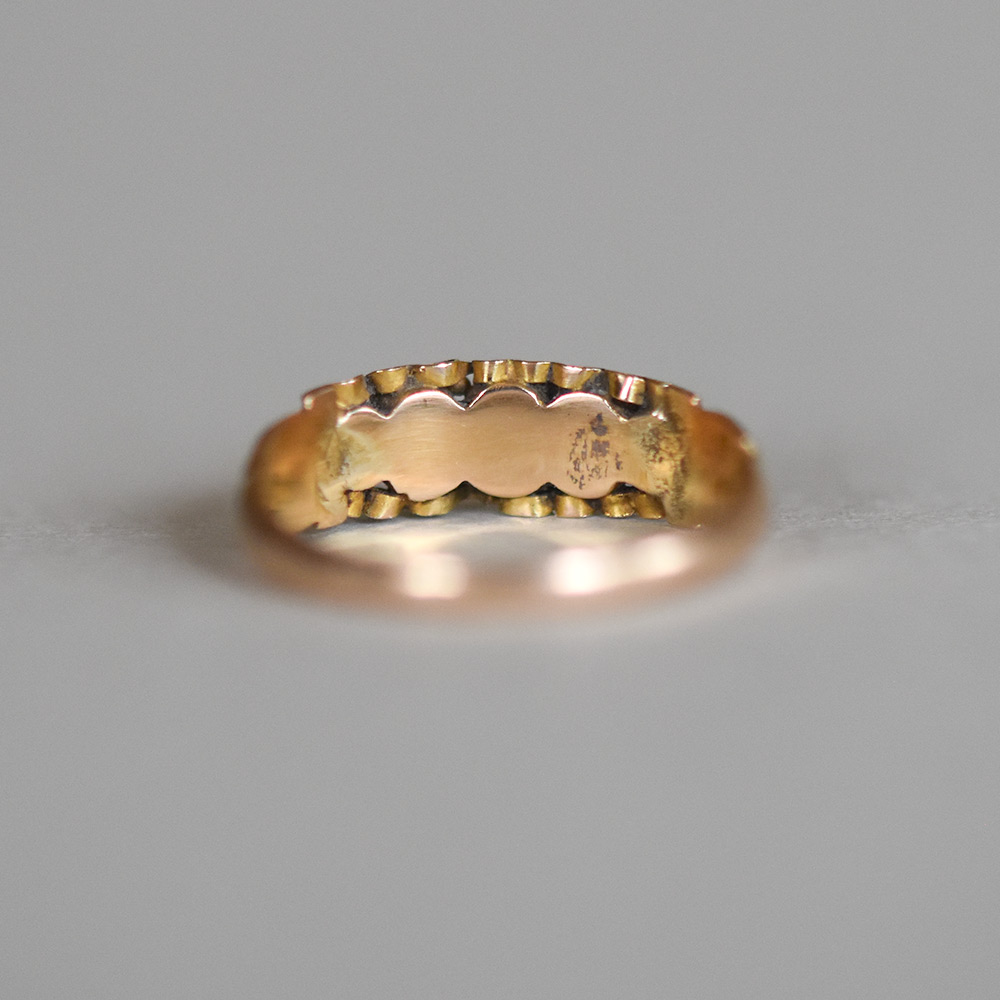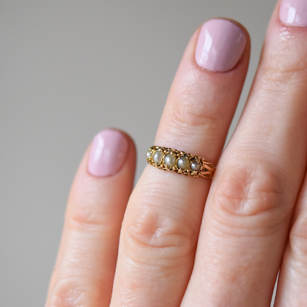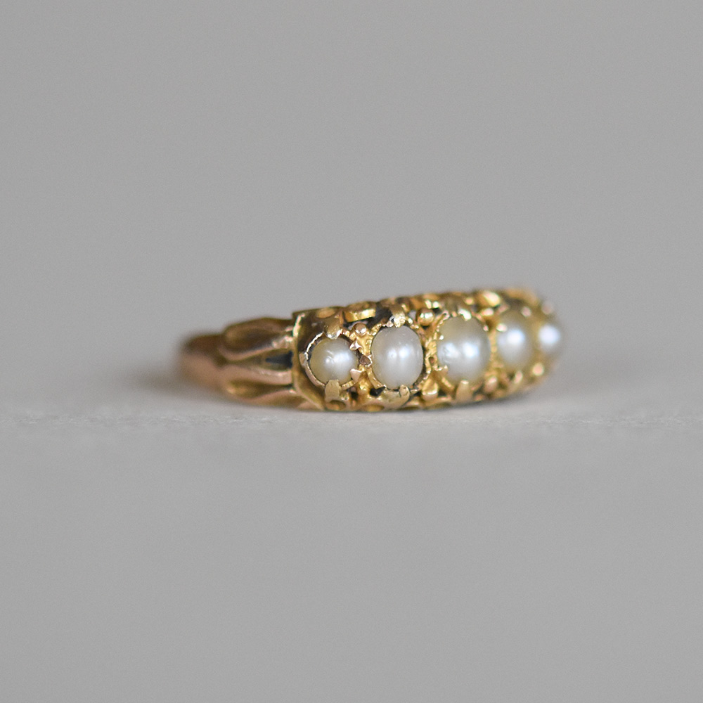 This sweet antique ring dates to the end of the Victorian era, c. 1890s. Beautifully set with a delicate row of creamy white and lustrous pearls in rich 15ct gold. 15ct gold was hallmarked in the United Kingdon between 1854 and 1931. The combination of the warmth of this high carat gold together with the short period it was used in jewellery make it desirable among collectors. Here, the largest pearl to the centre measures 3 mm and the ring face measures 5 mm wide. The pearls are in wonderful condition with gorgeous silk like lustre. On a plain shank. A beautiful piece to wear on its own or stuck with others.