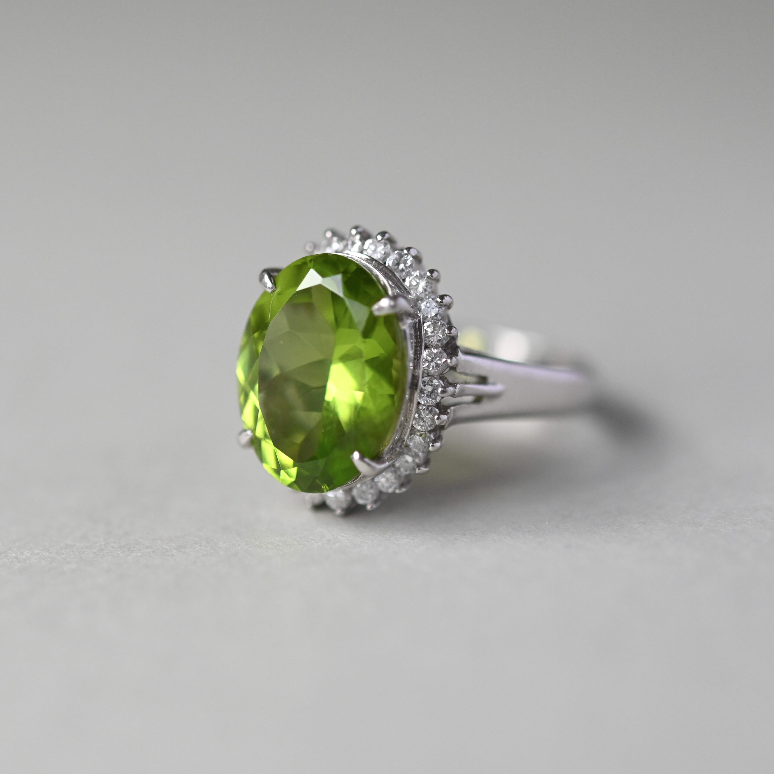A beautiful and classically design platinum ring, claw set with an oval cut peridot. The peridot is a delicious apple hue and measures 13 mm x 10 mm, totalling 5.29 carats. Surrounded by a halo of mini diamonds, totalling 0.42 carats. The cluster measures 16 mm x 13 mm. With a gorgeous scroll detail gallery and a plain shank. This timeless piece would make a perfect engagement ring. Please note the box shown is for demonstration purposes.