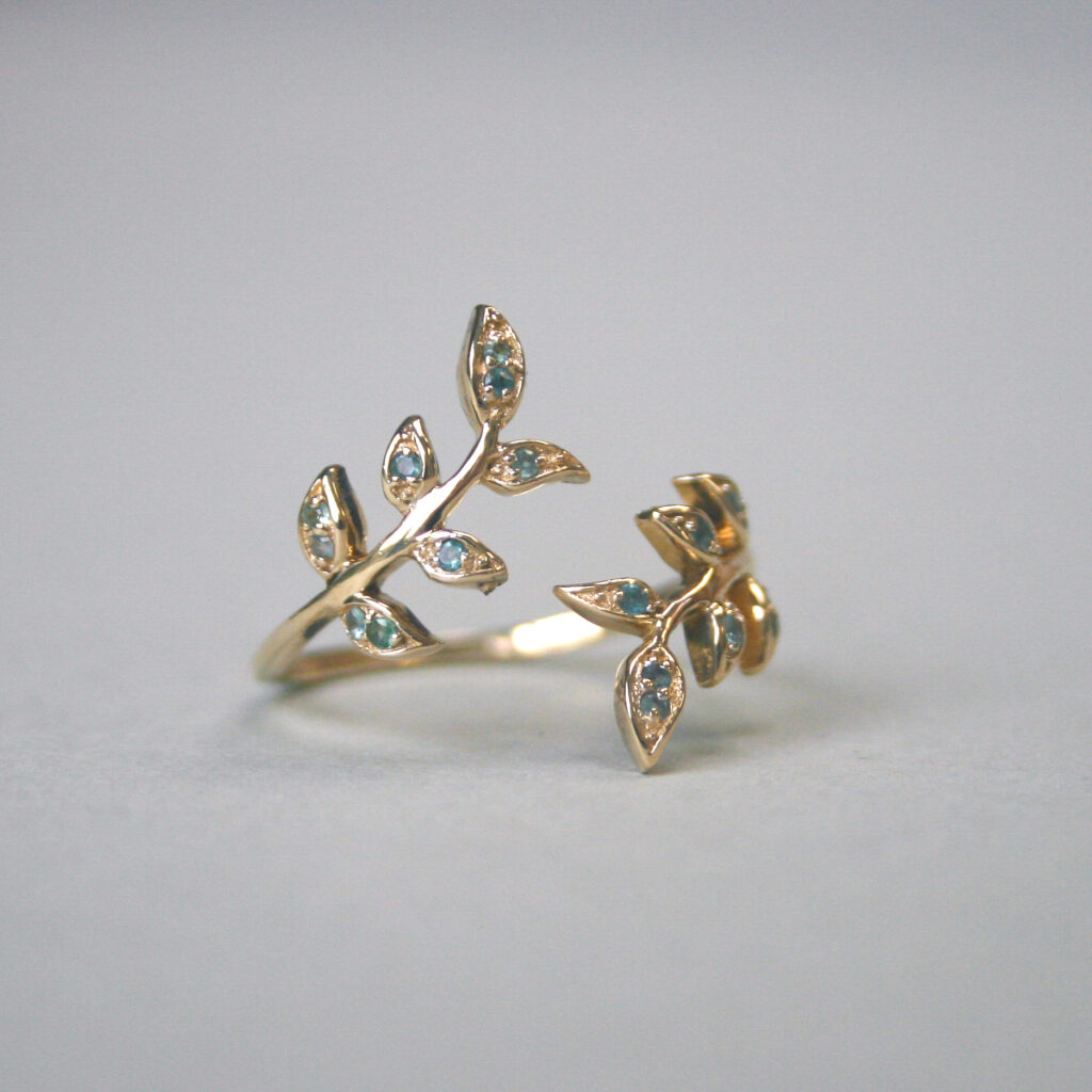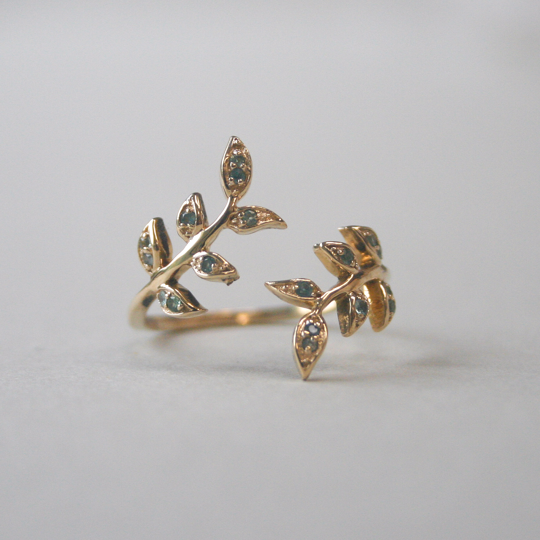An aesthetically design contemporary 9ct gold ring, beautifully designed as a leaf garland. Set with mini alexandrite. The alexandrite are a bluish-reddish-green hue and well matched. This sweet piece curls around the finger and feels lovely to wear. Ring face measures 18 mm x 20 mm. Lovingly made in the last 20 or so years.