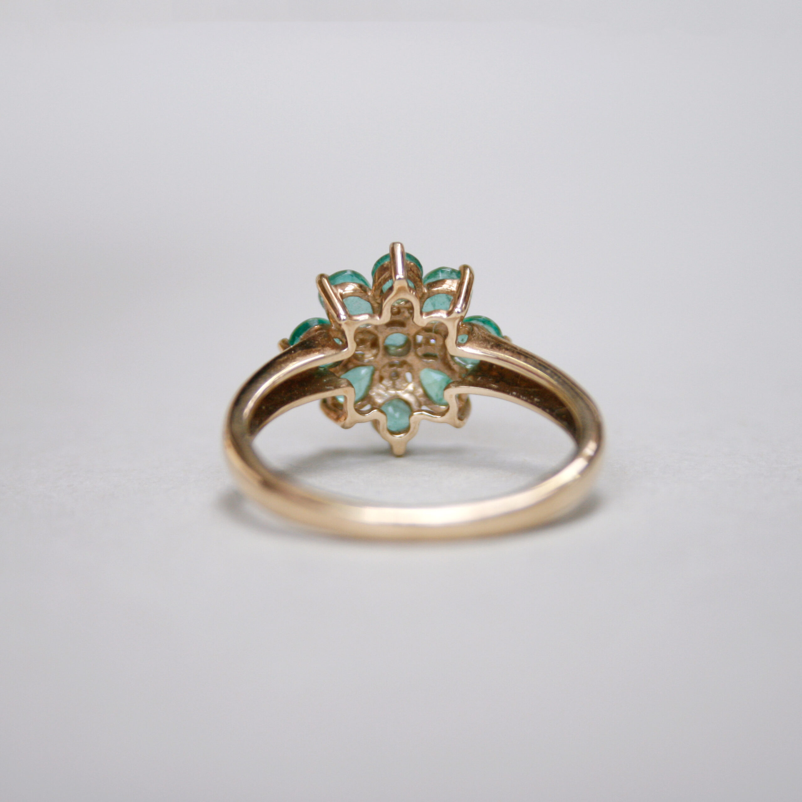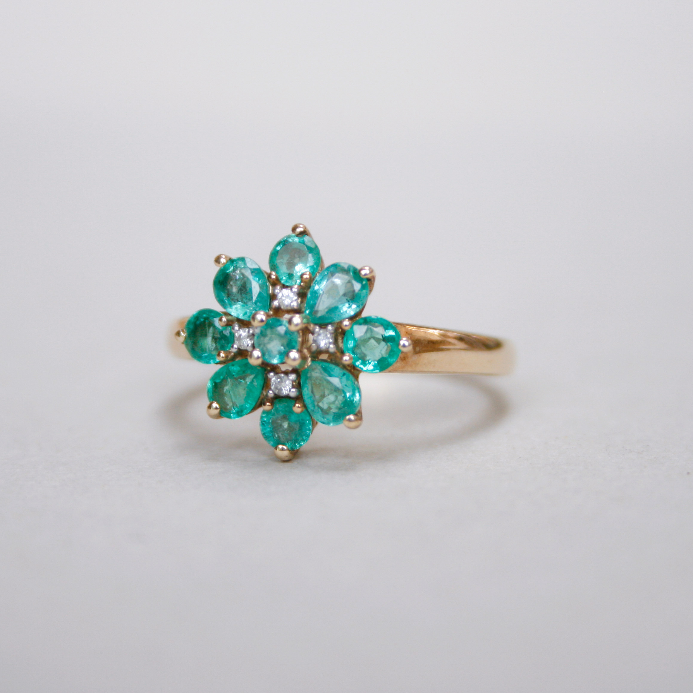 Contemporary 9ct gold emerald and diamond floral cluster ring