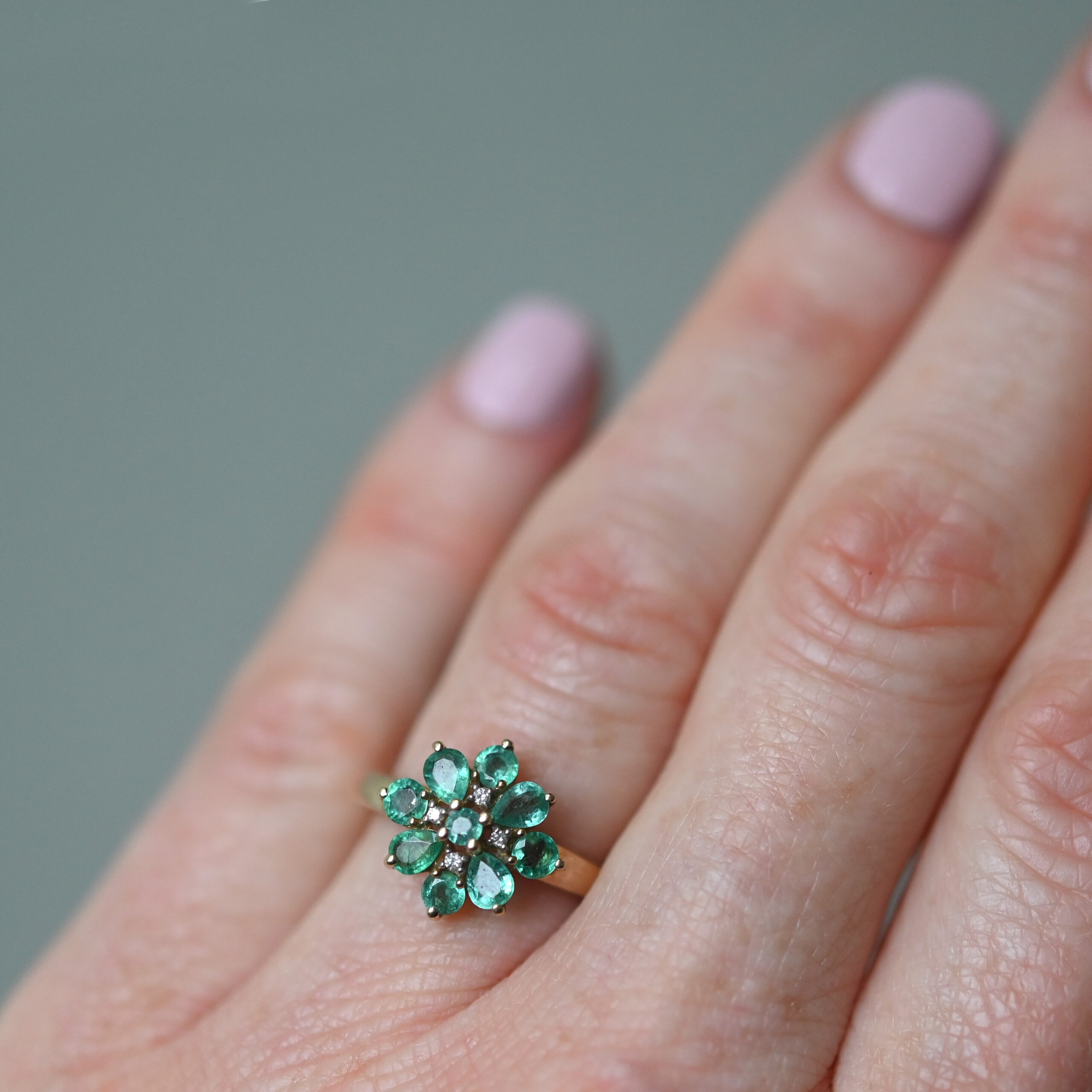 A beautifully designed 9ct gold ring, claw set with round and tear shaped emeralds and a mini diamond in a floral cluster. The emeralds are a gorgeous hue and well saturated. With split detail shoulders and a plain shank. A very pretty contemporary 9ct gold ring.