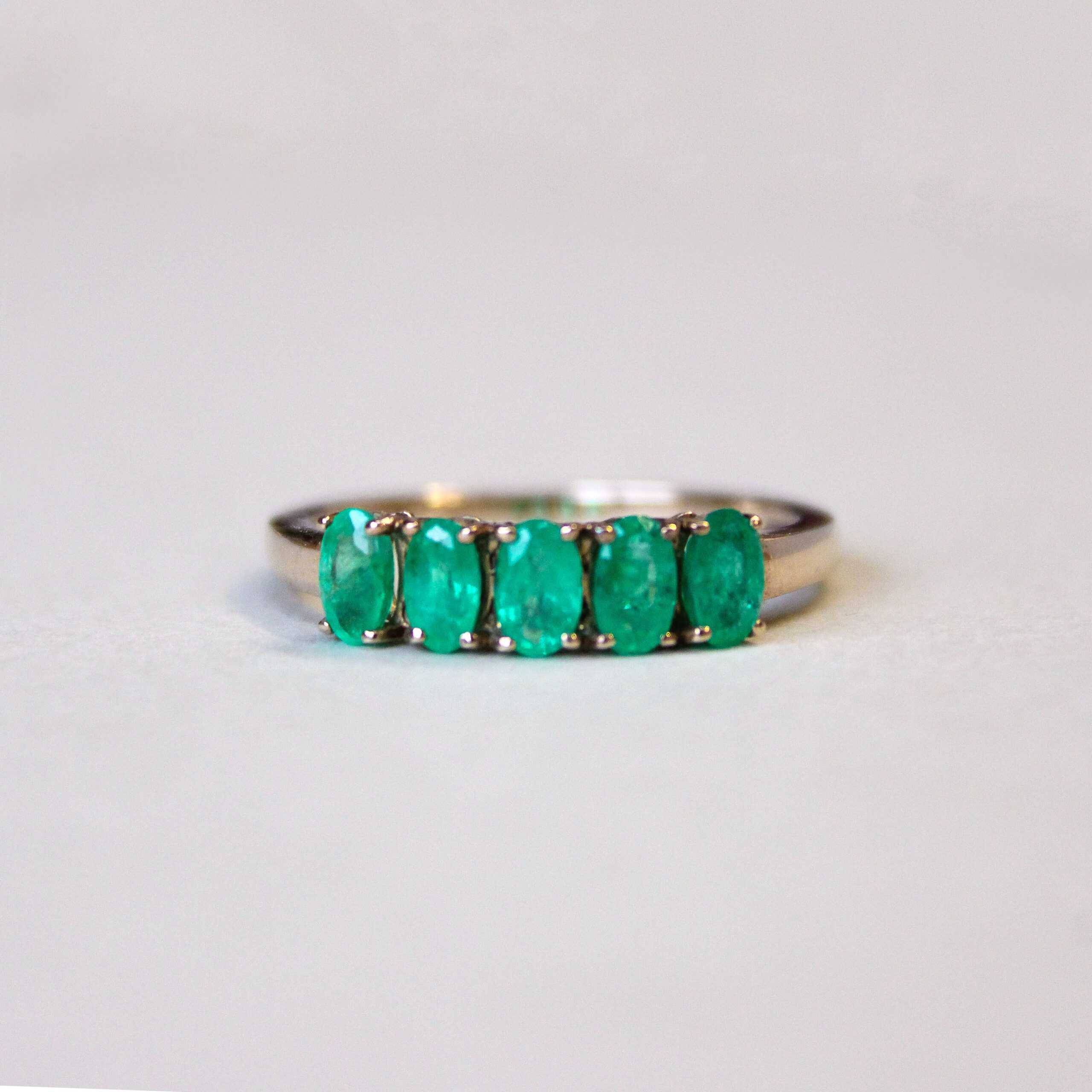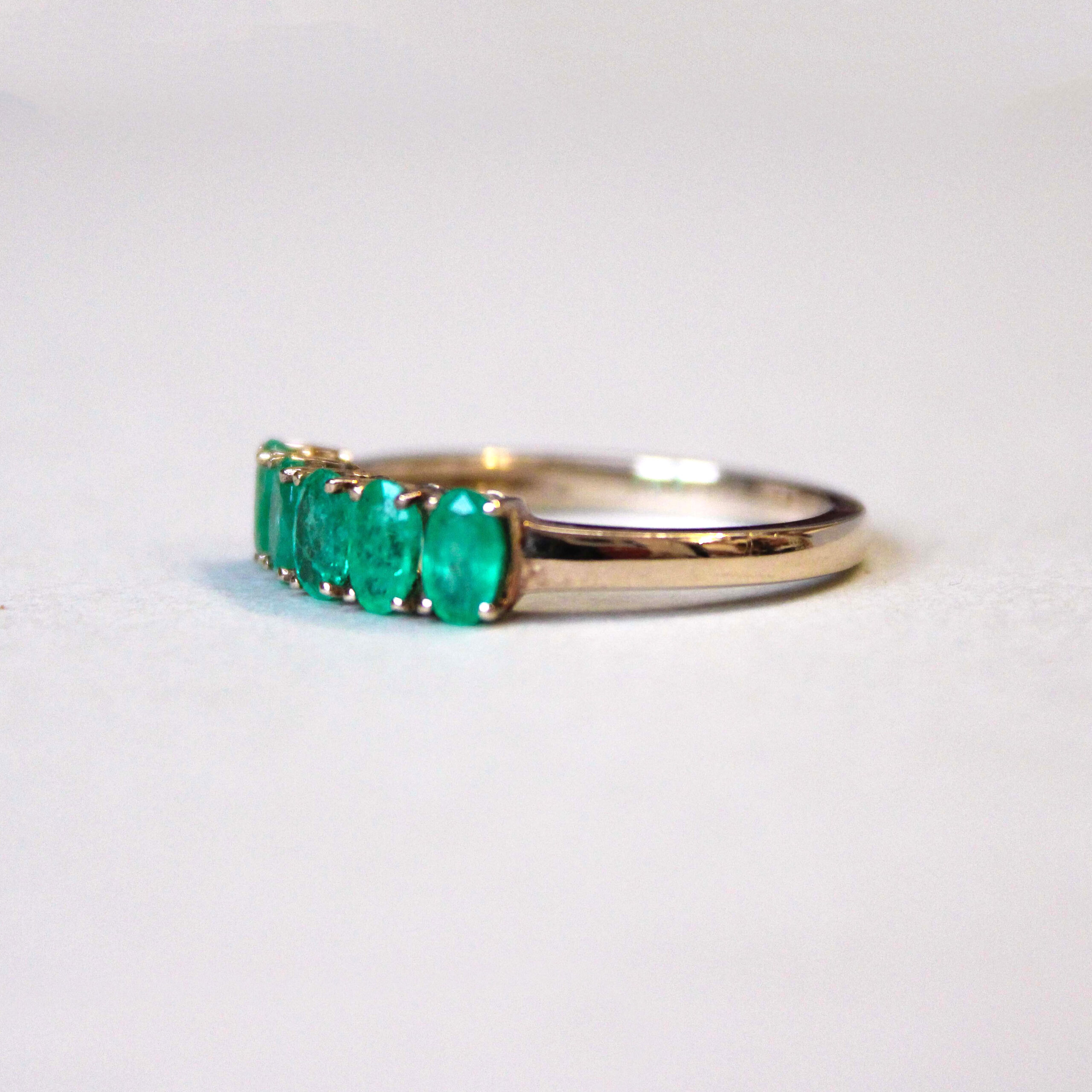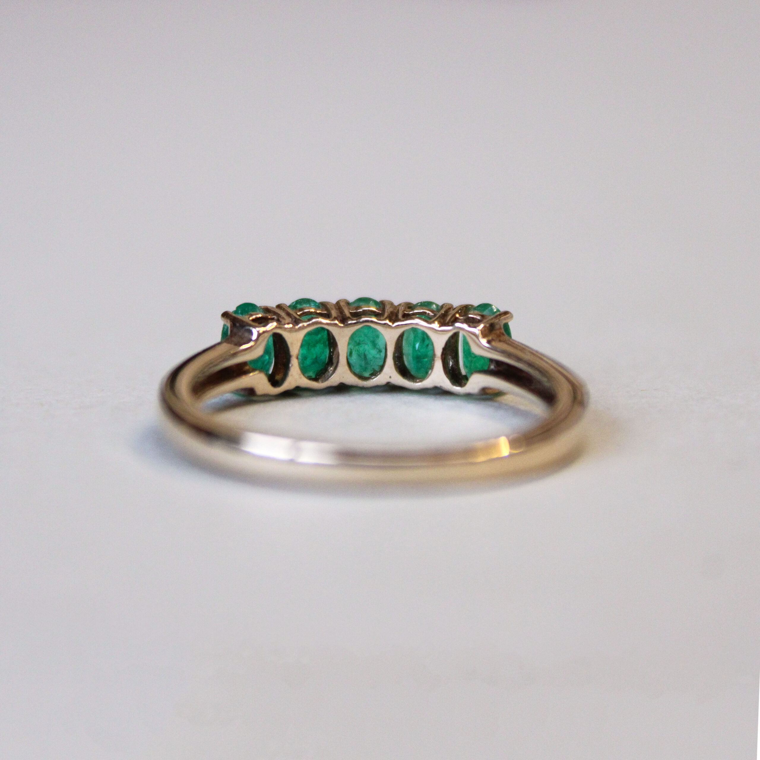 A classically designed 9ct gold emerald ring claw set with five vibrant oval-shaped emeralds on a plain shank. The emeralds are beautifully matched and each measure 5 x 3 mm. The ring face measures 19 x 5 mm. A perfect piece to wear on its own or stack with others.
