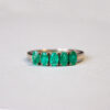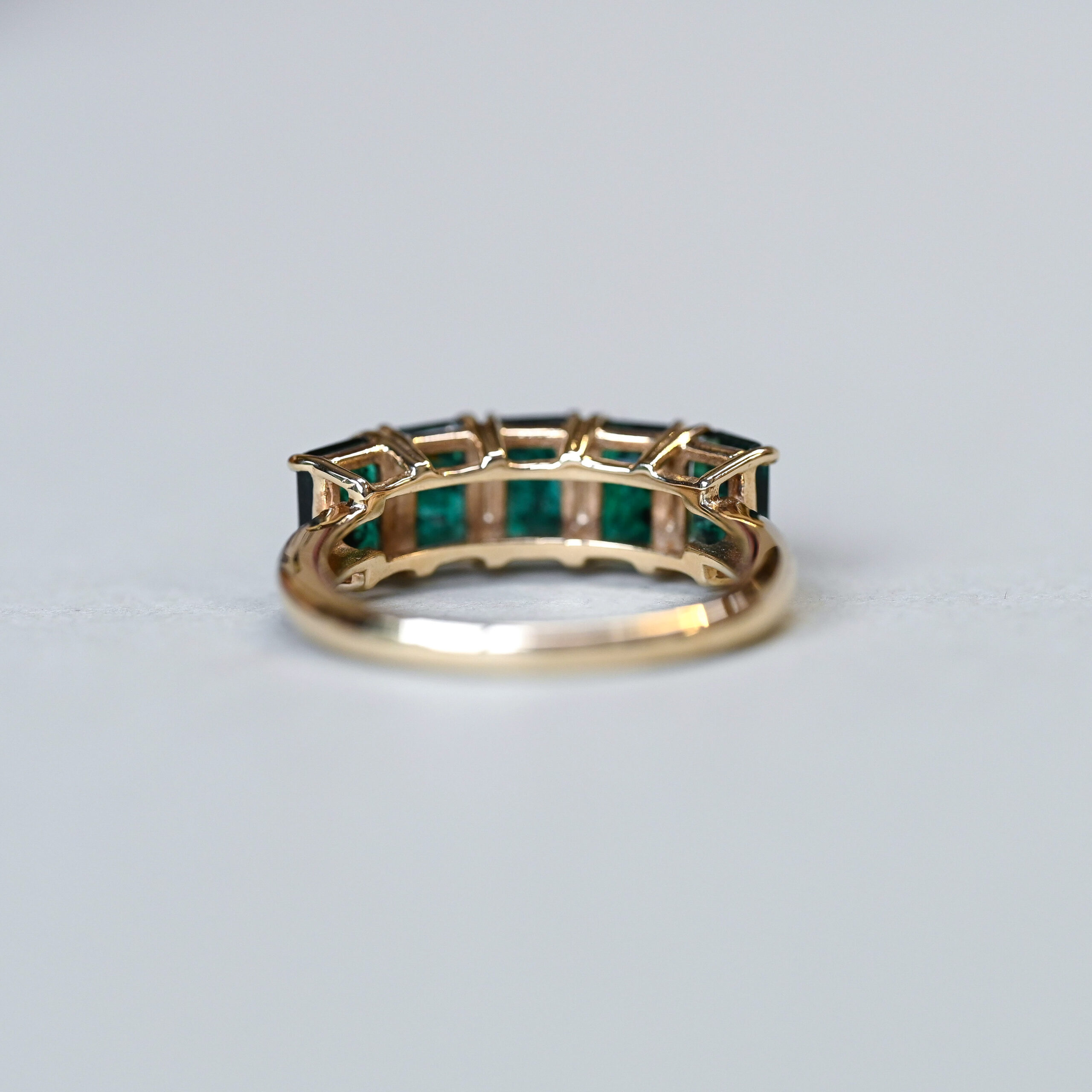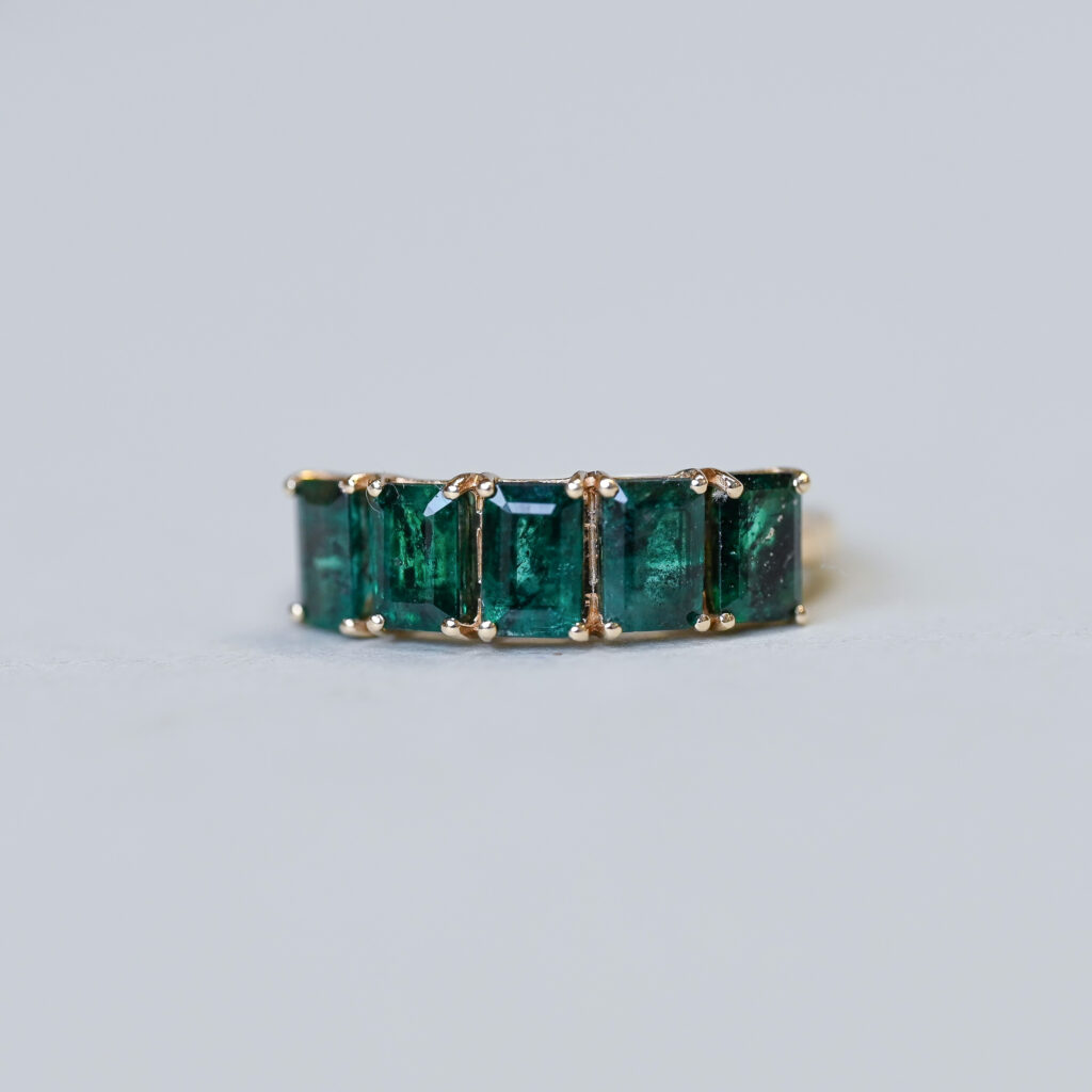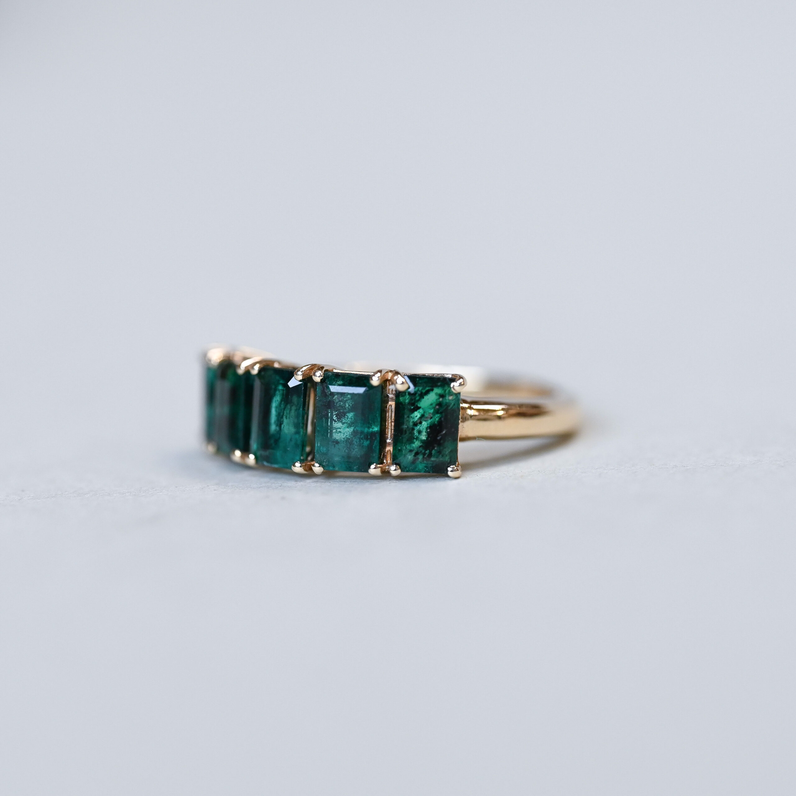 An aesthetically designed contemporary 9ct gold ring, claw set with five step cut emeralds. The emeralds are a deep and rich forest green hue and display a beautiful range of natural inclusions. Each emerald measures 5 mm x 3 mm, with an estimated total of 1.0 carat. On a plain shank. A perfect piece to wear on its own or stack with others. Lovingly made in the last 20 years or so.