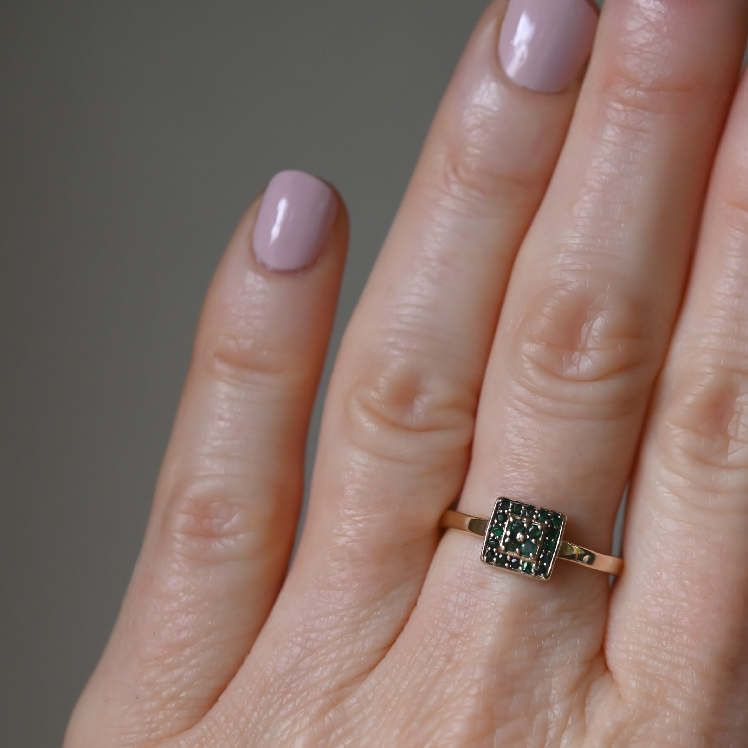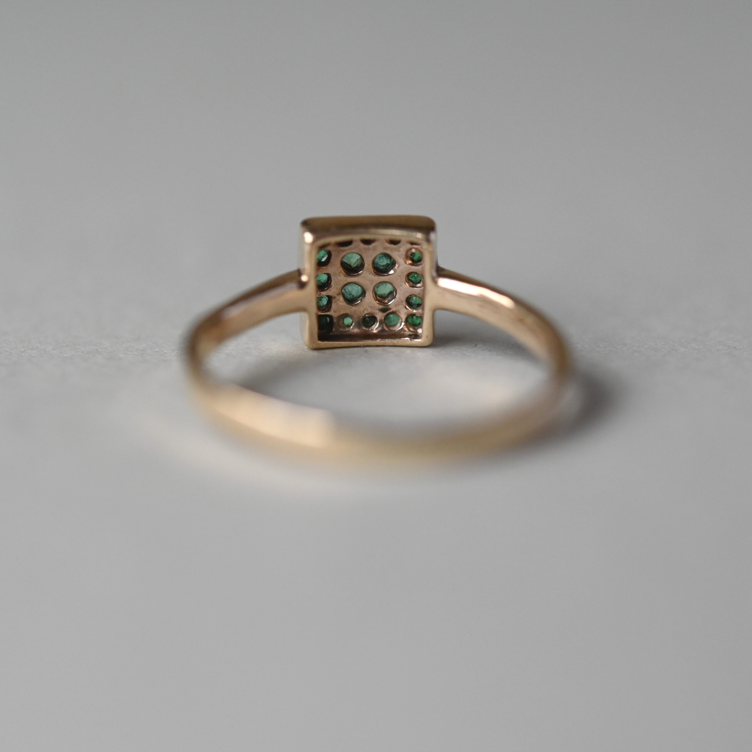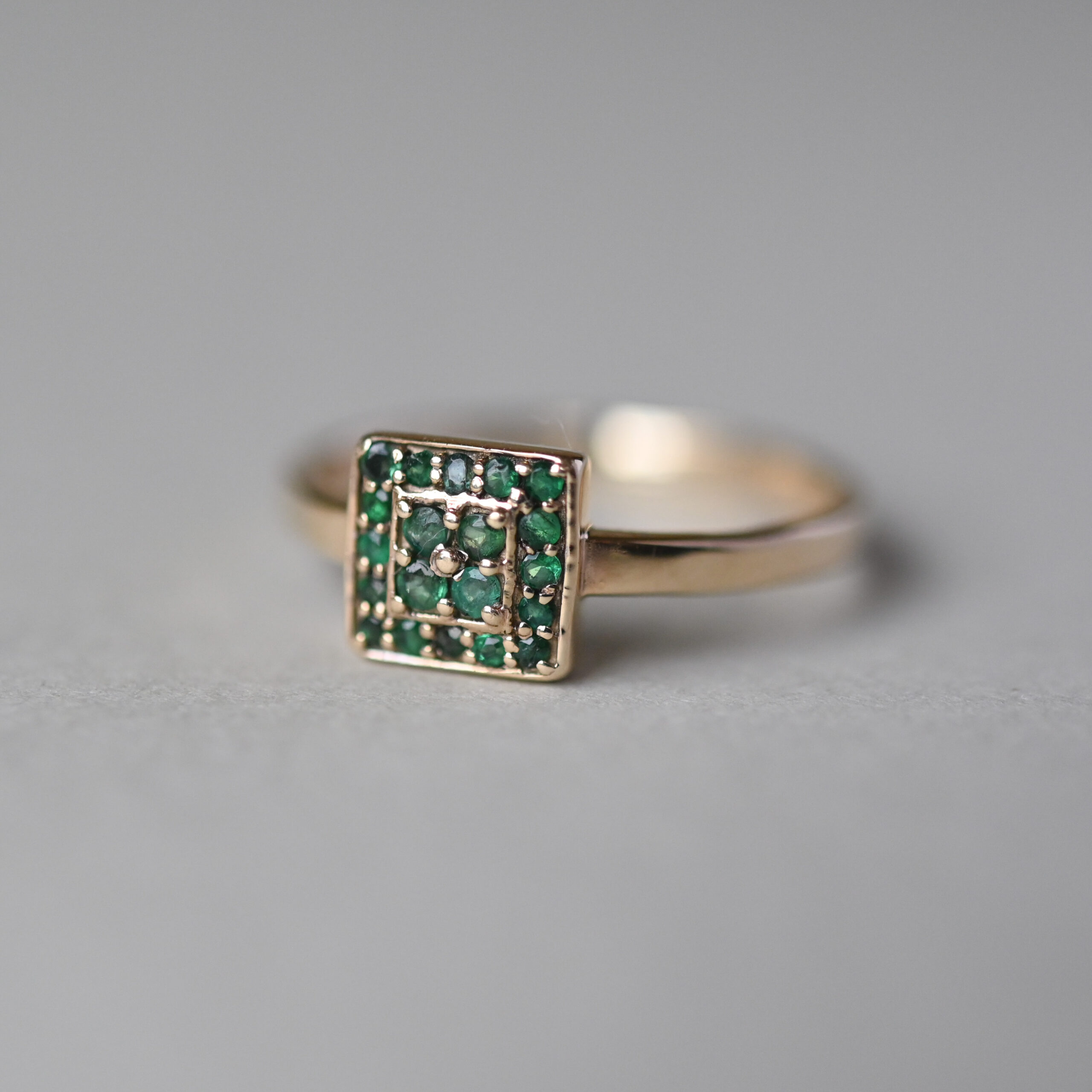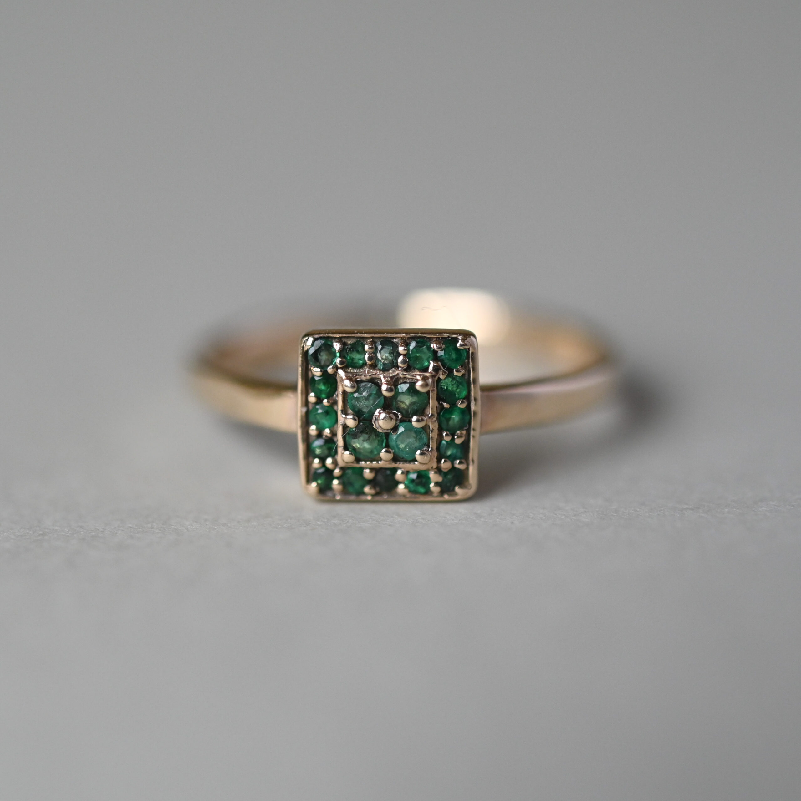 An aesthetically designed contemporary 9ct gold ring set with round cut emeralds in a square shape cluster. The emeralds are a rich forest green hue and are well matched. The cluster measures 7 mm in diameter. On a plain shank. A perfect piece to wear on its own or stack with others. Lovingly made in the last 20 years or so.