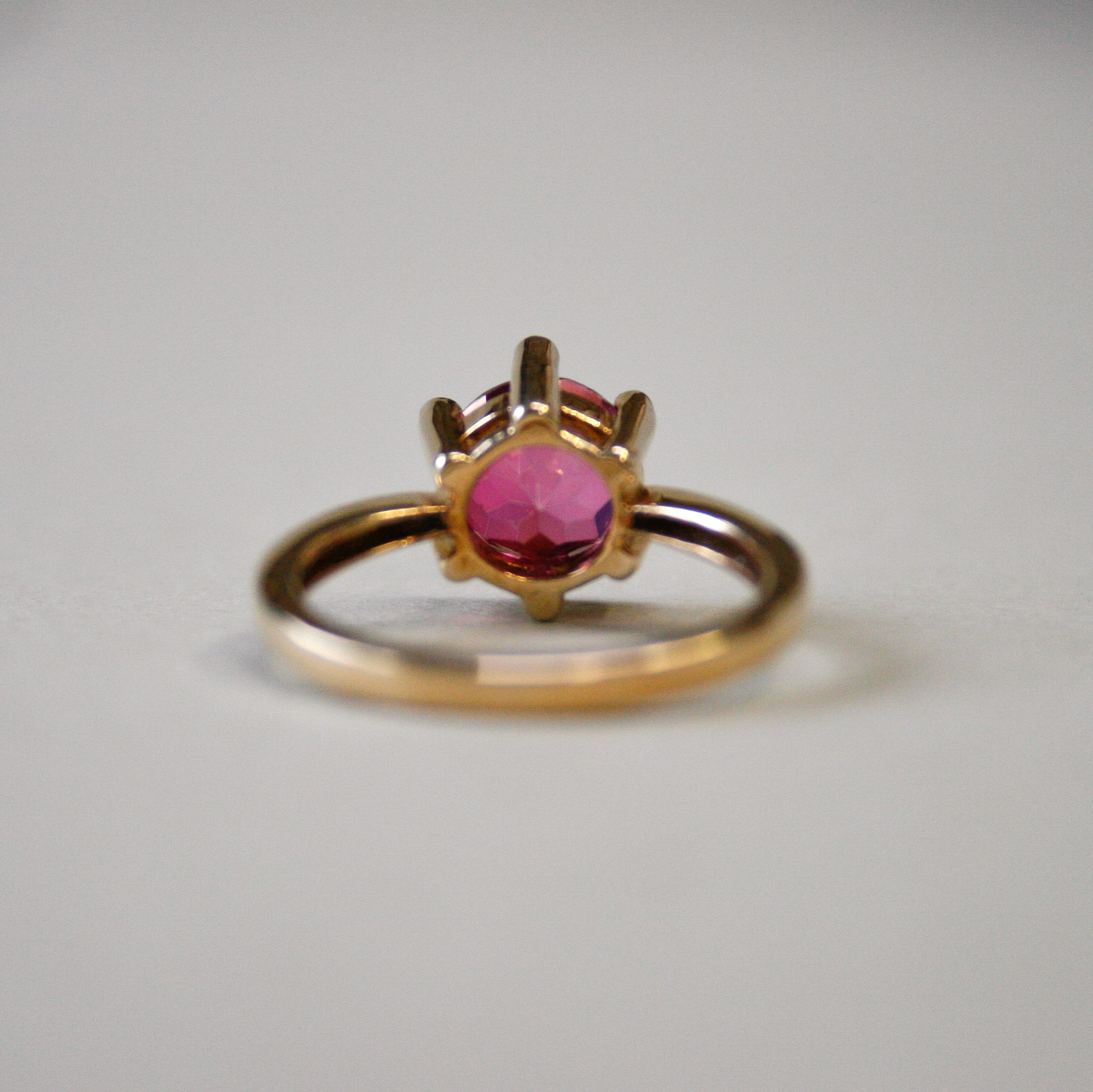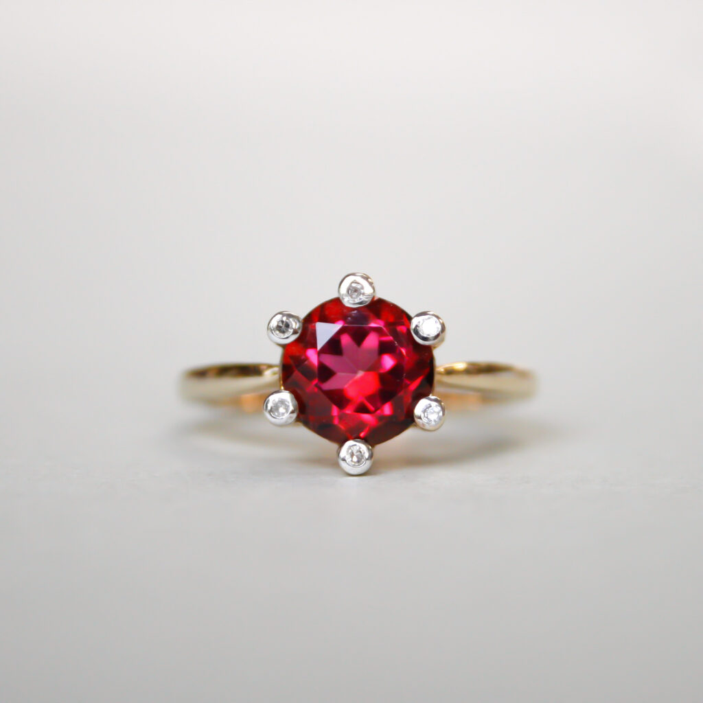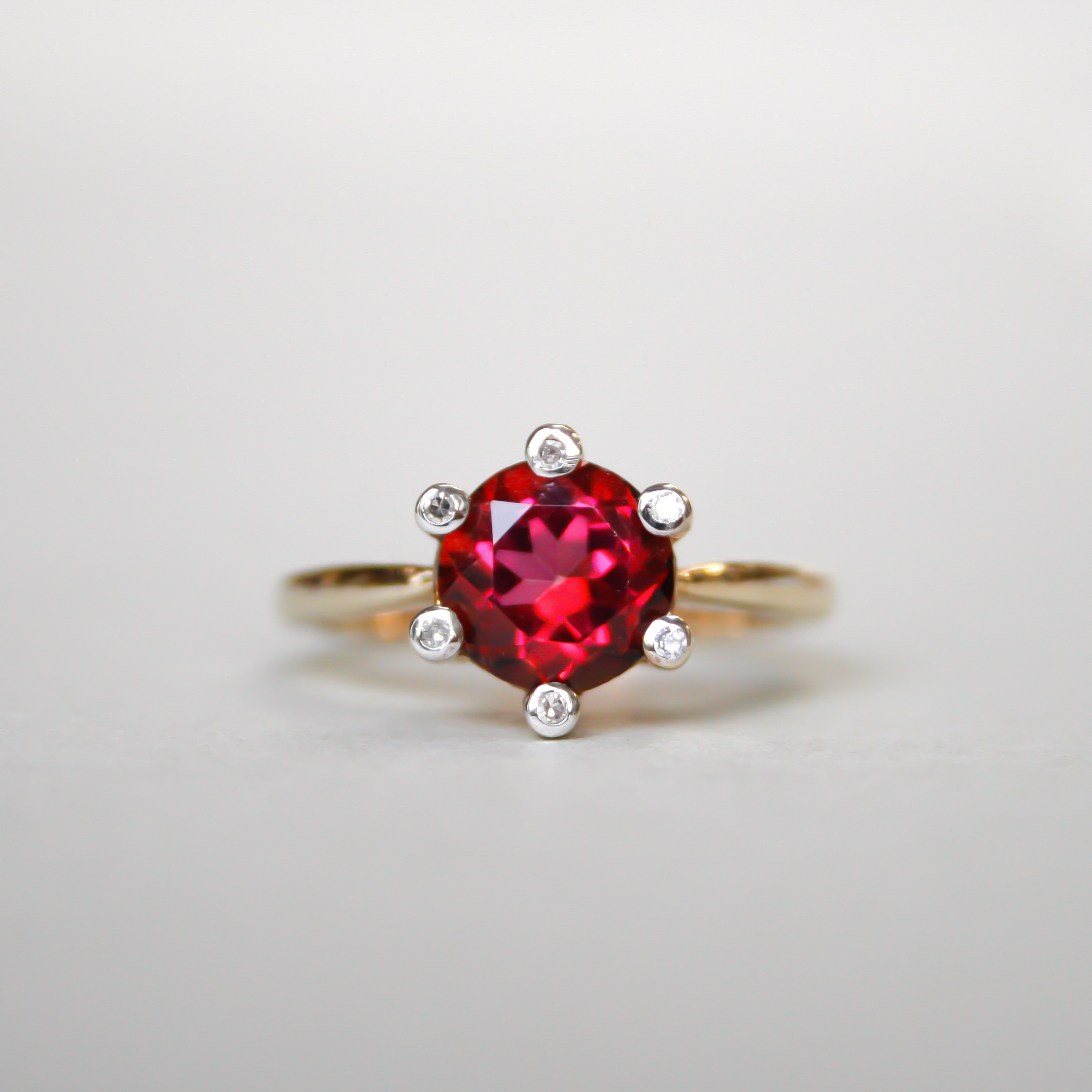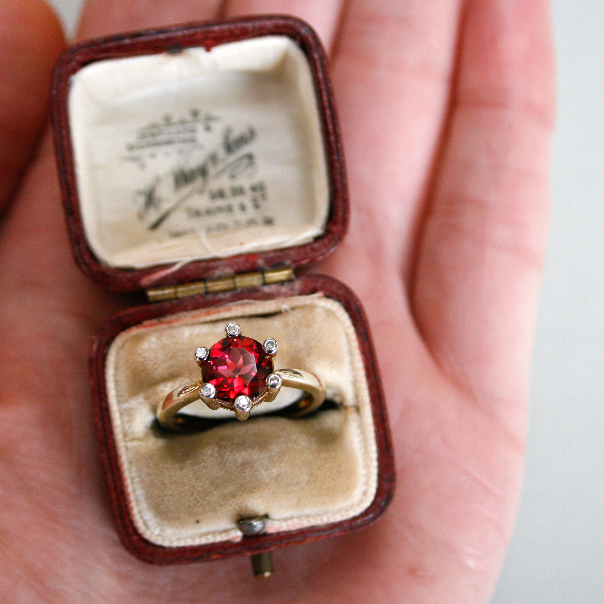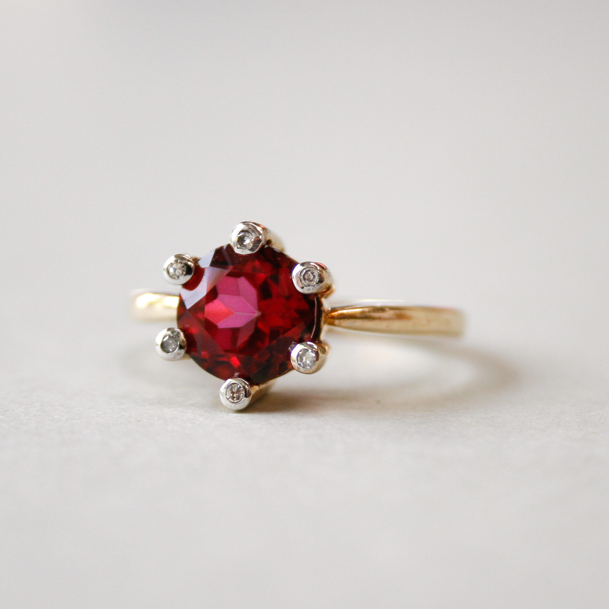 An aesthetically designed 9ct gold ring, claw set with a central round cut garnet. The garnet is a gorgeous, rich pomegranate hue and measures 8 mm in diameter. Each claw finial is set with a mini brilliant cut diamond. Flanked by tapered shoulders. On a plain shank. Lovingly made in the last 20 or so years. Please note the box shown is for demonstration purposes.