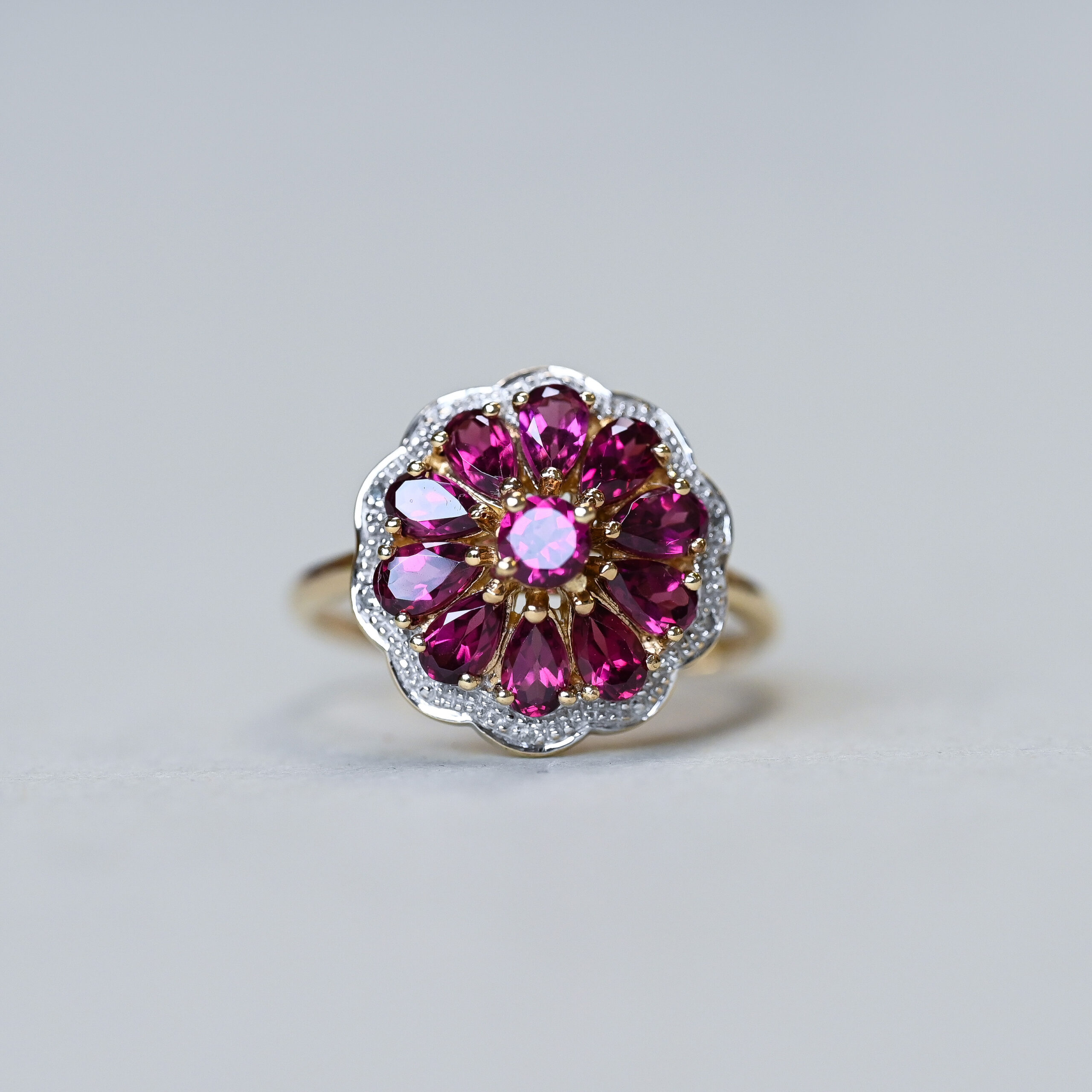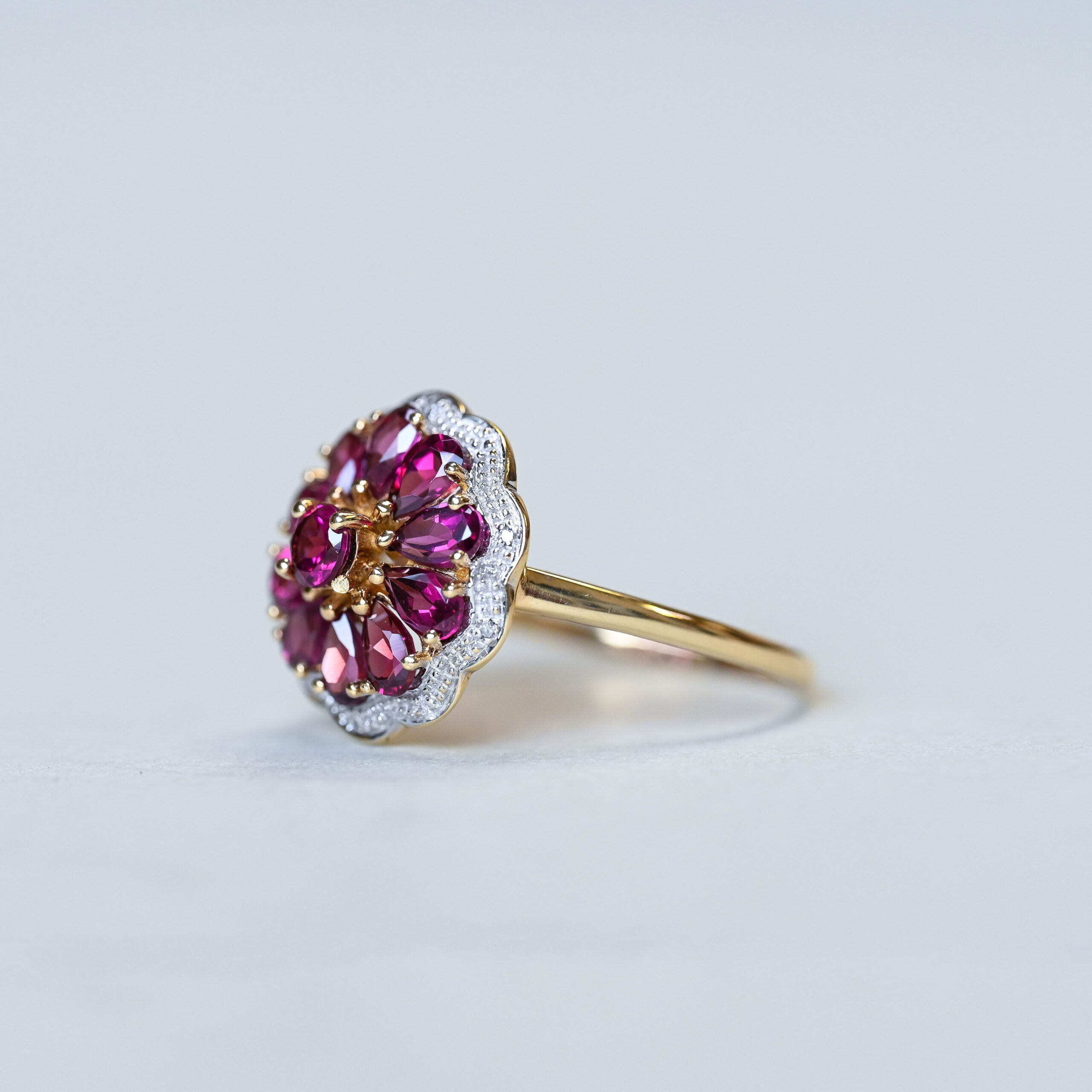 Contemporary 9ct gold garnet and mini diamond floral cluster ring