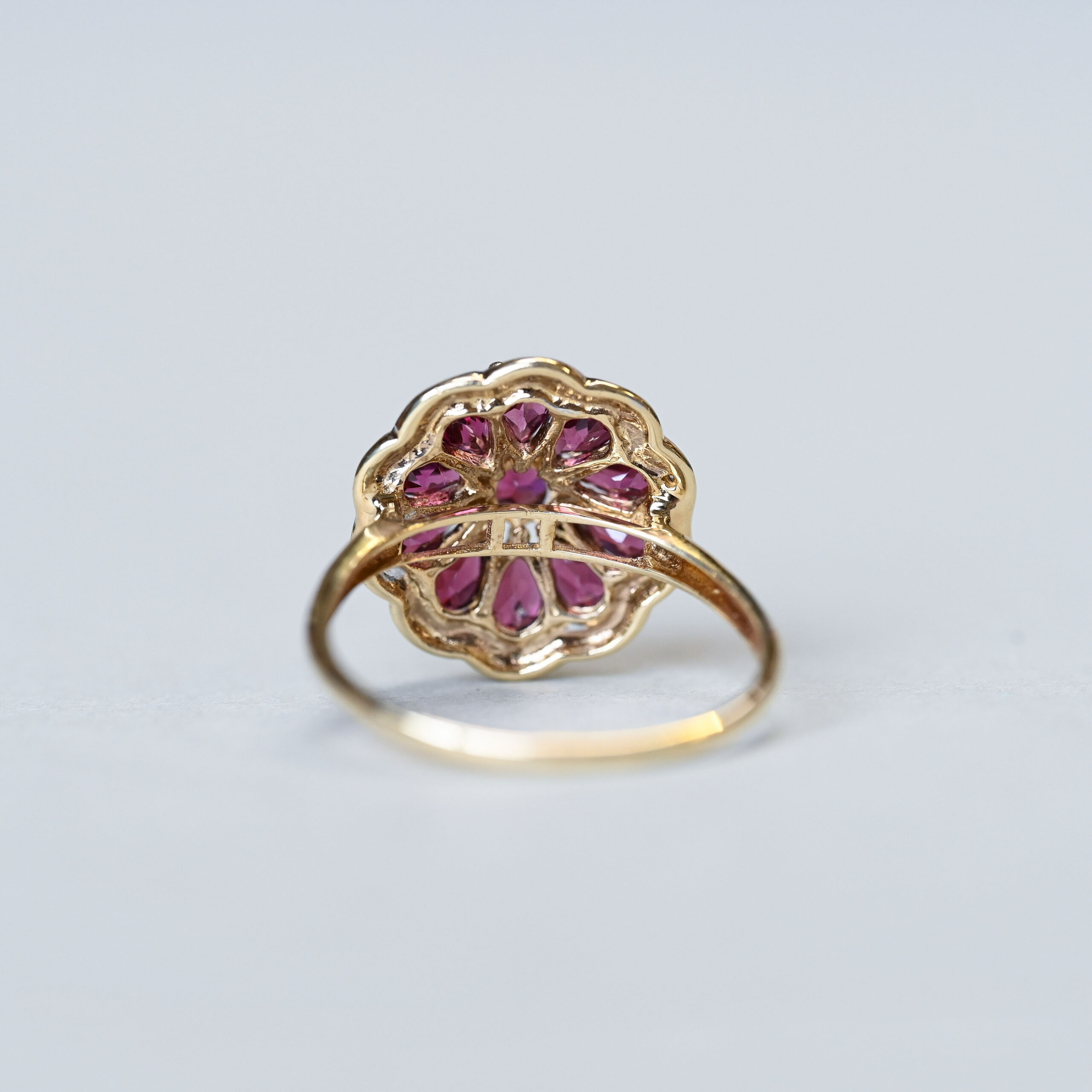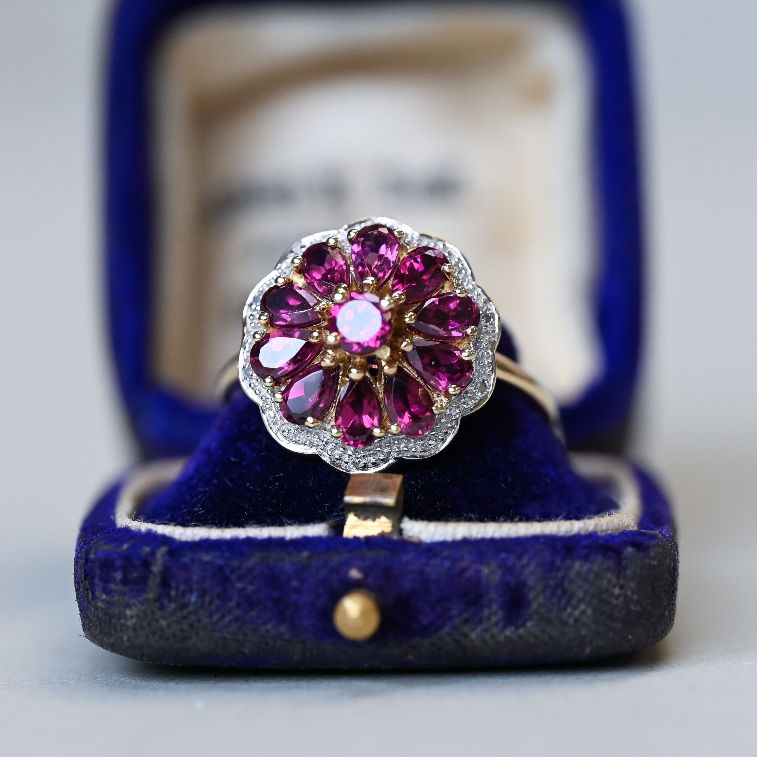 A beautifully designed contemporary 9ct gold ring, claw set with a central round cut garnet and a halo of pear cut garnet petals. Encircled with line of mini diamonds in a white gold highlighted floral frame. The garnets are a rich purplish-red berry hue and gorgeously saturated. The cluster measures 20 mm in diameter. On a plain shank. A very pretty contemporary 9ct gold ring, lovingly made in the last 20 years or so. Please note the box shown is for demonstration purposes.