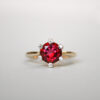 A beautifully rich and vibrant garnet five stone half hoop contemporary ring designed with antique Georgian aesthetics in mind. This pretty piece is set with a line of subtly graduated gorgeous garnets in a closed back setting. The largest garnet measures 6 mm x 4 mm. Flanked by grooved detail shoulders and a plain shank. A perfect piece to wear on its own or stack with others.