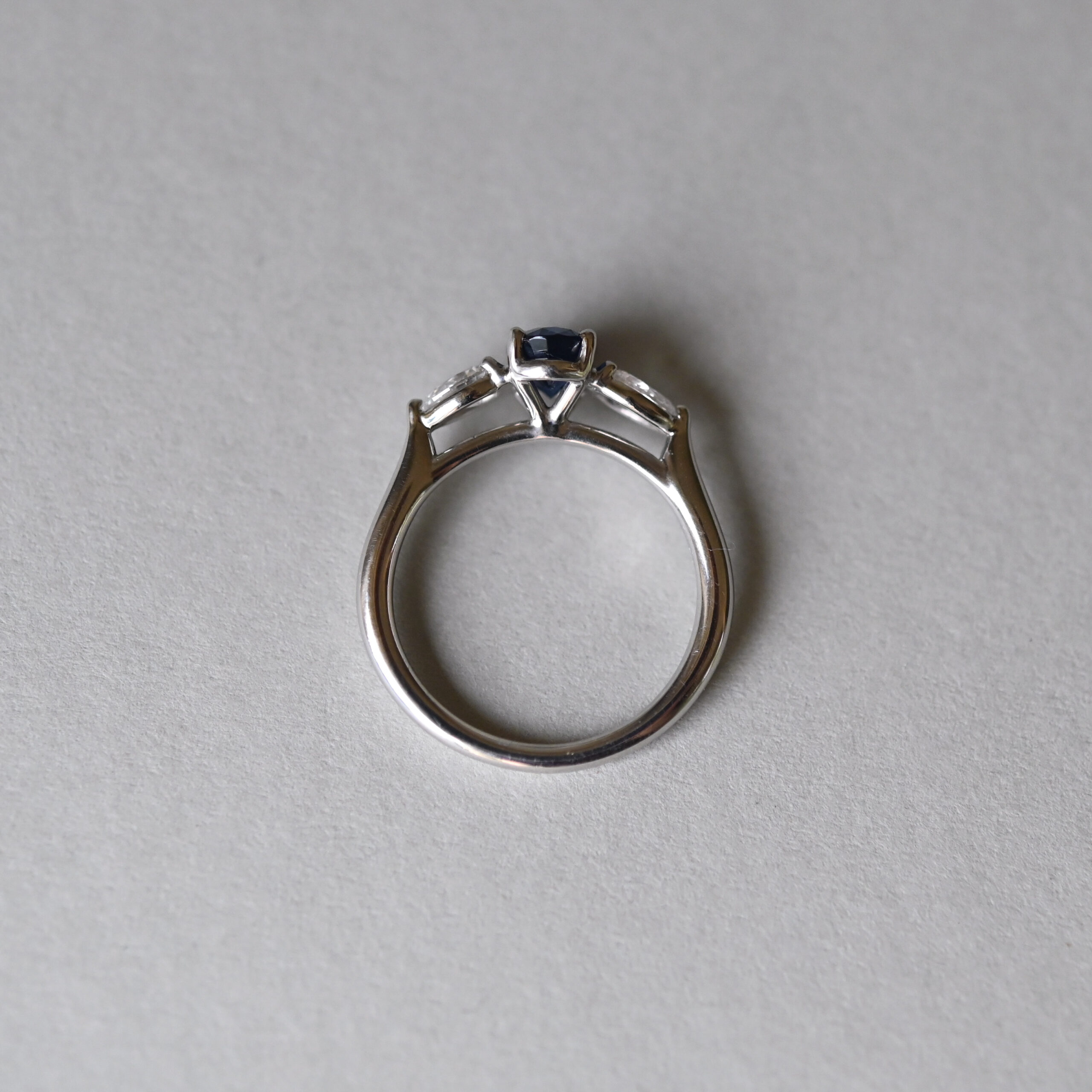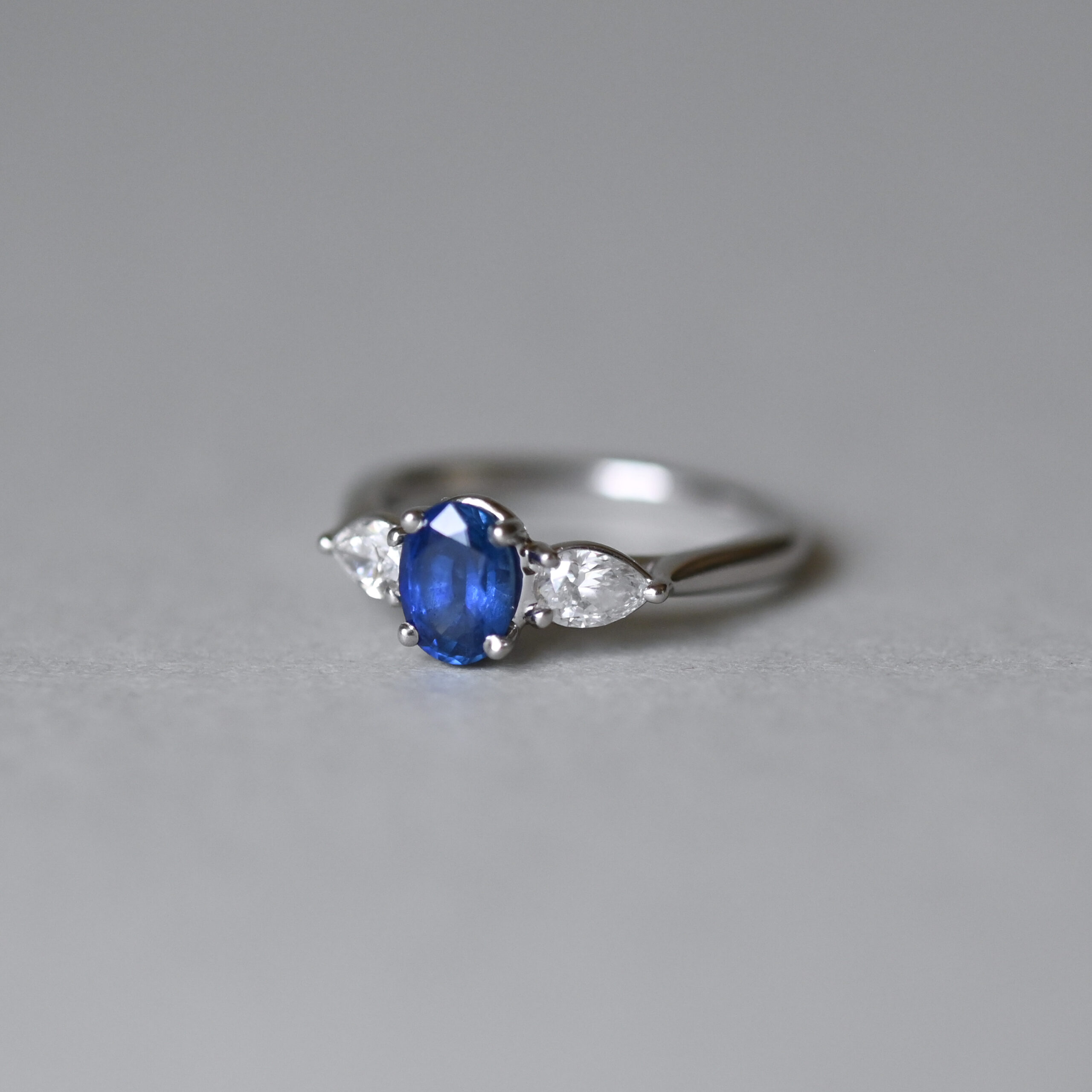 Exquisite contemporary sapphire and pear cut diamond platinum engagement ring