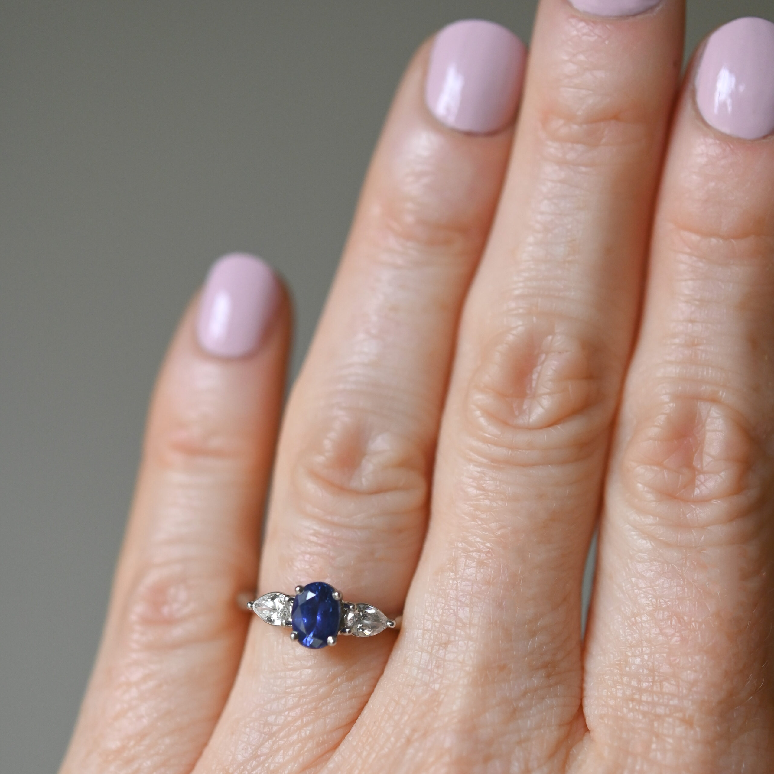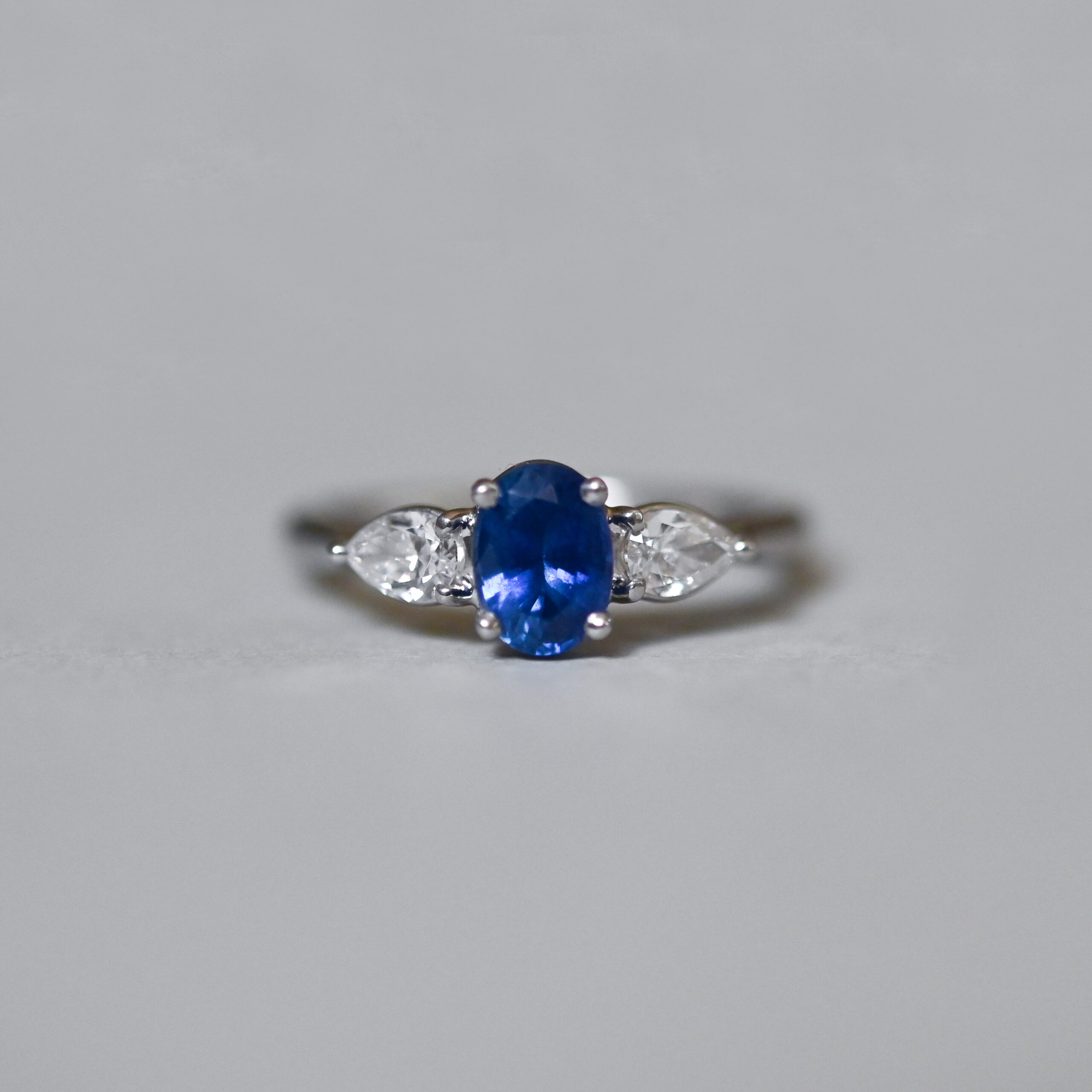An exceptional contemporary sapphire and diamond three stone platinum ring. Claw set with an oval cut sapphire estimated to be 0.87 carats. The sapphire is a rich and beautifully saturated velvet blue hue. Flanked by pear cut diamonds to either side. The diamonds are bright, white and very lively. An estimated total of 0.40 carats diamonds. This gorgeous piece would make a perfect vintage style engagement ring.
