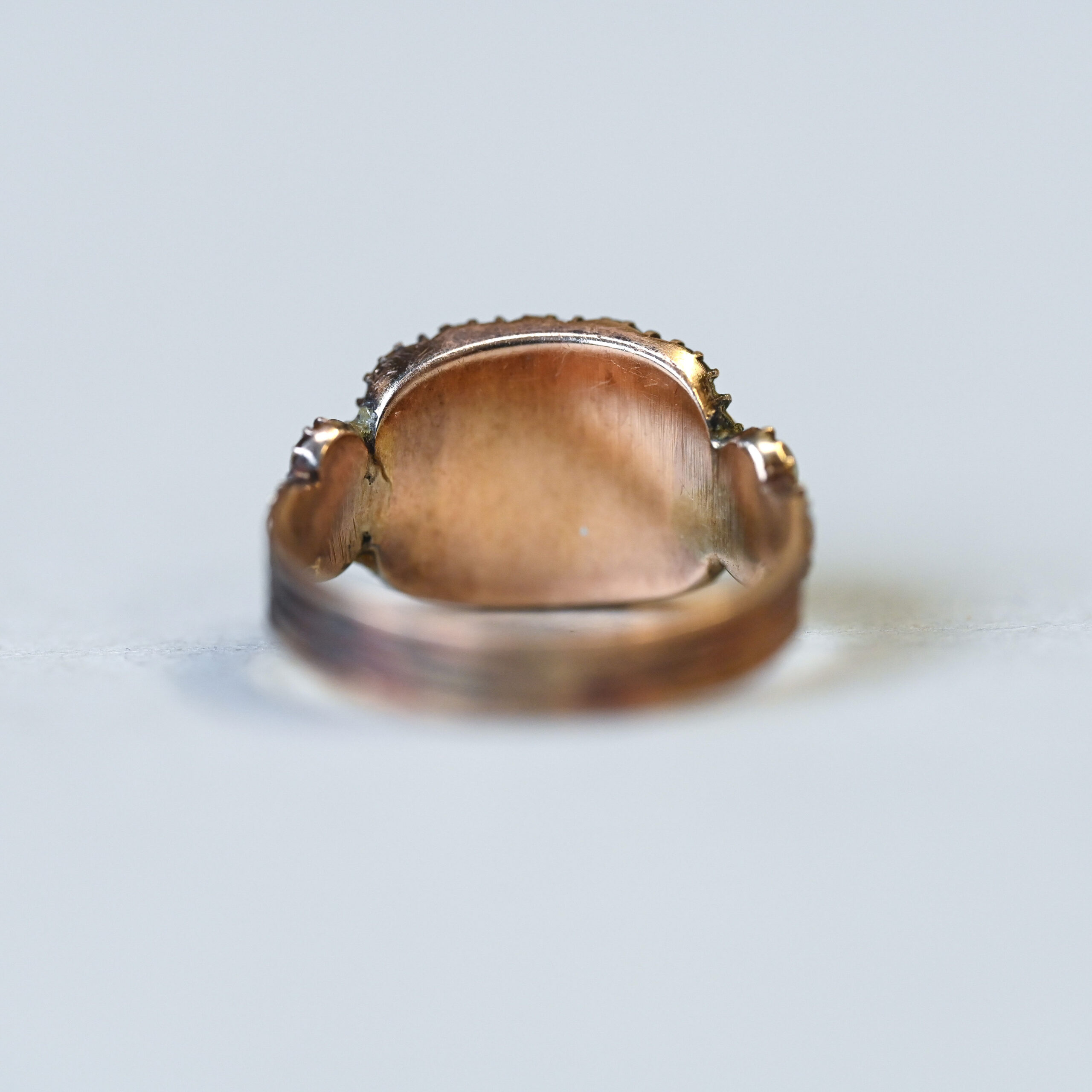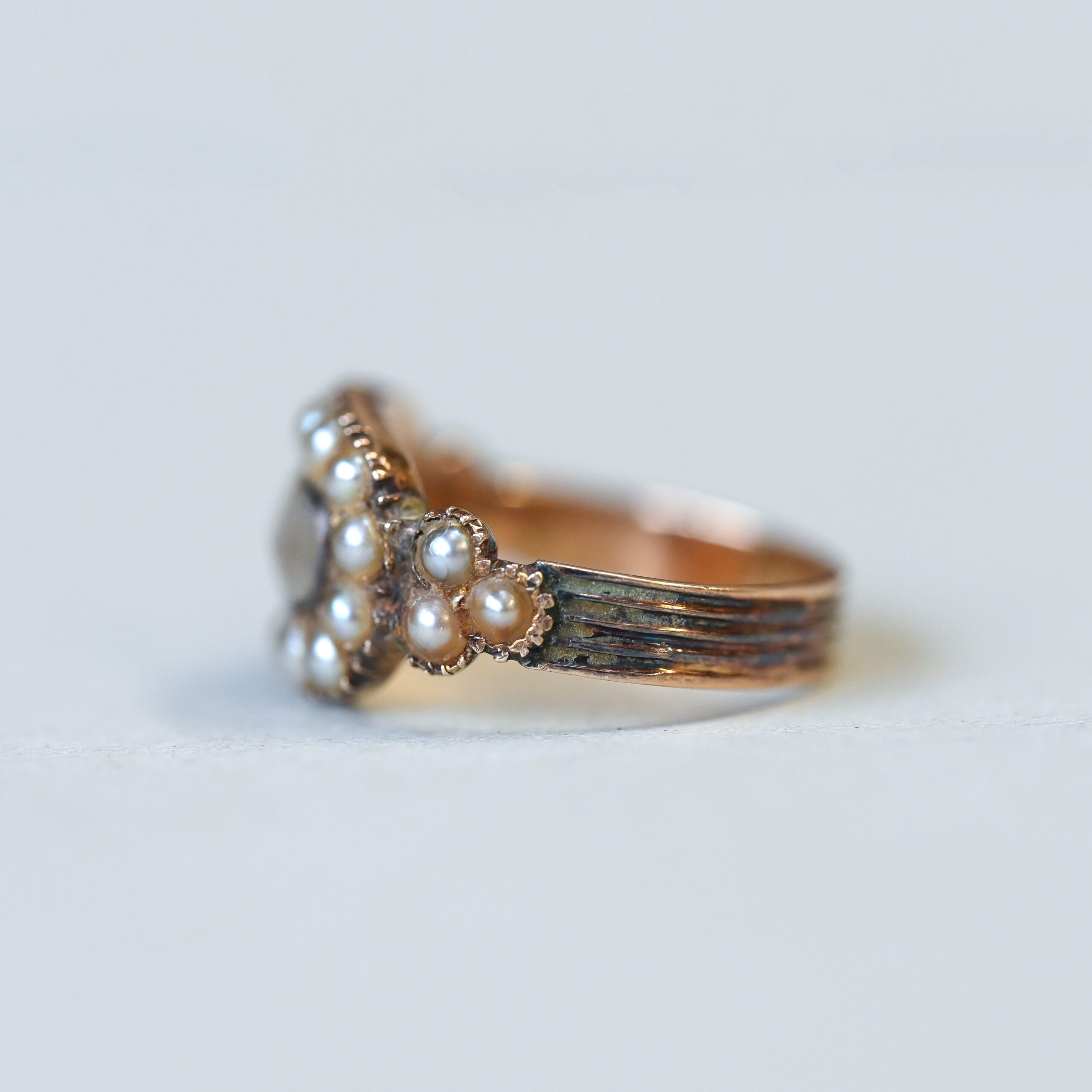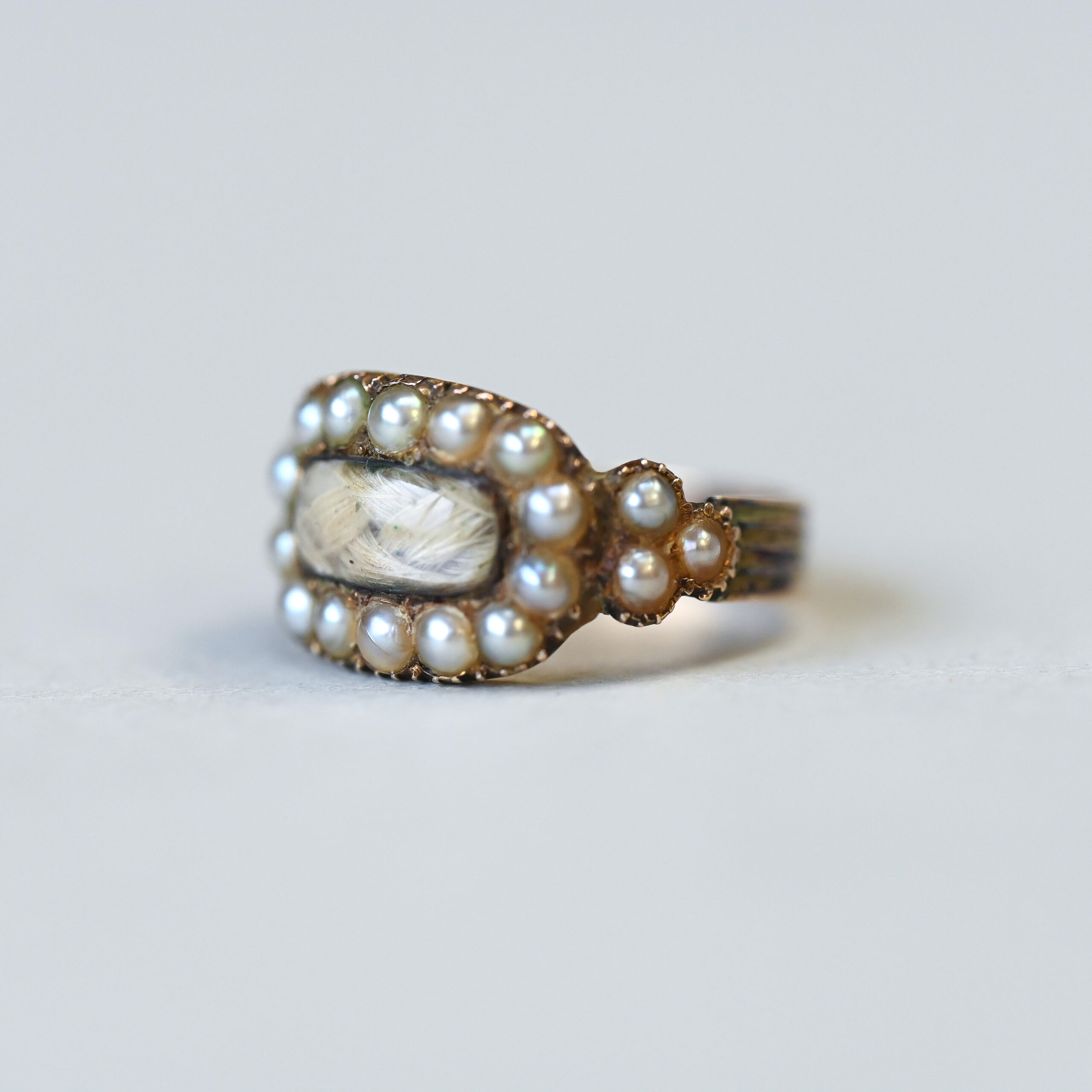 Georgian 9ct gold pearl and woven hair glazed mourning ring c.1830s