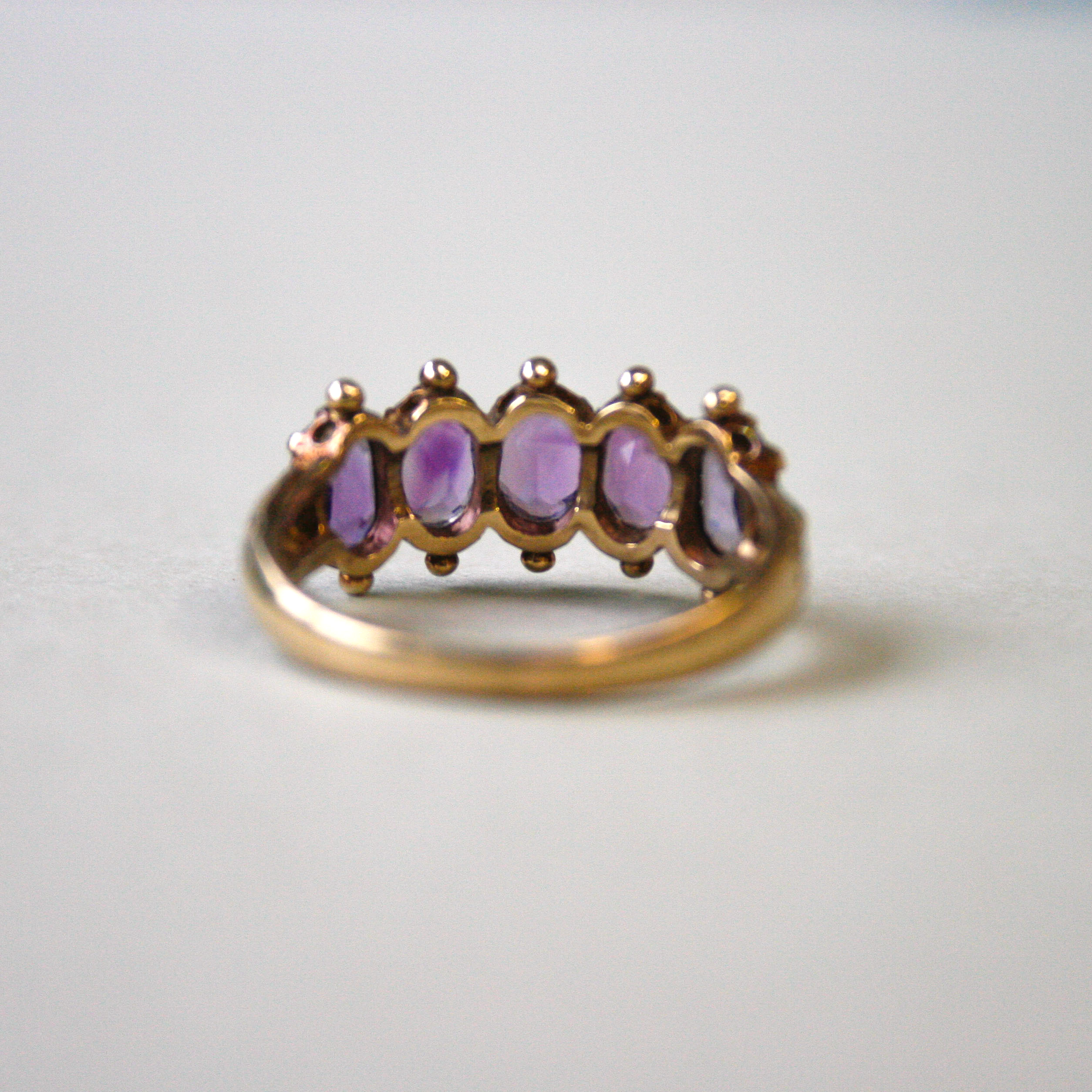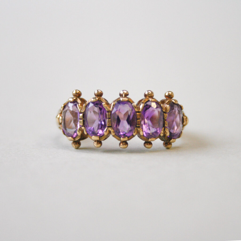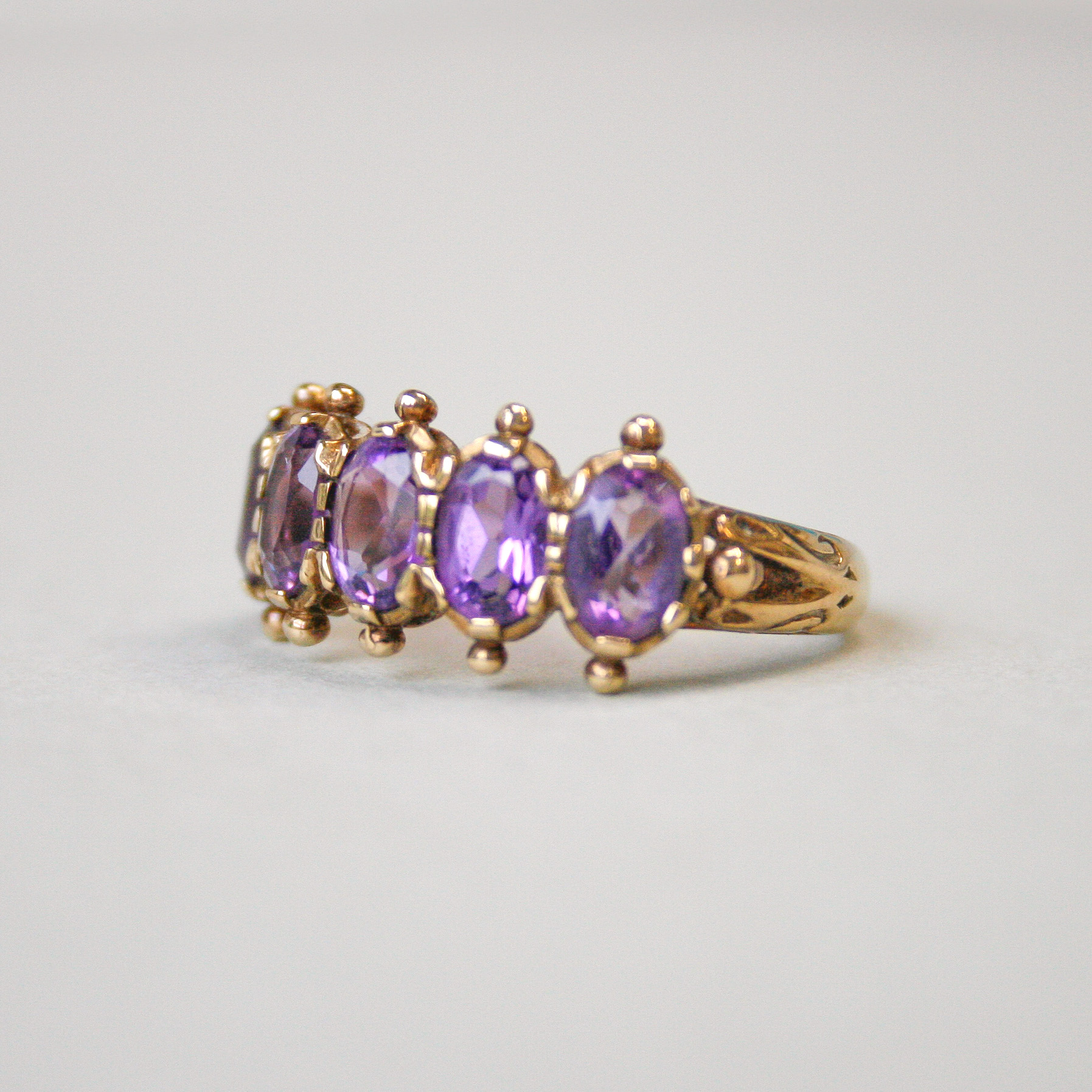 A beautiful vintage 9ct gold ring designed with antique Georgian aesthetics in mind. Set with a line of oval cut amethysts, sweetly framed by beaded detailing. The amethyst measure 6 mm x 4 mm and are well matched. Ring face measures 24 mm at widest. Loving made in the last 20 or so years.