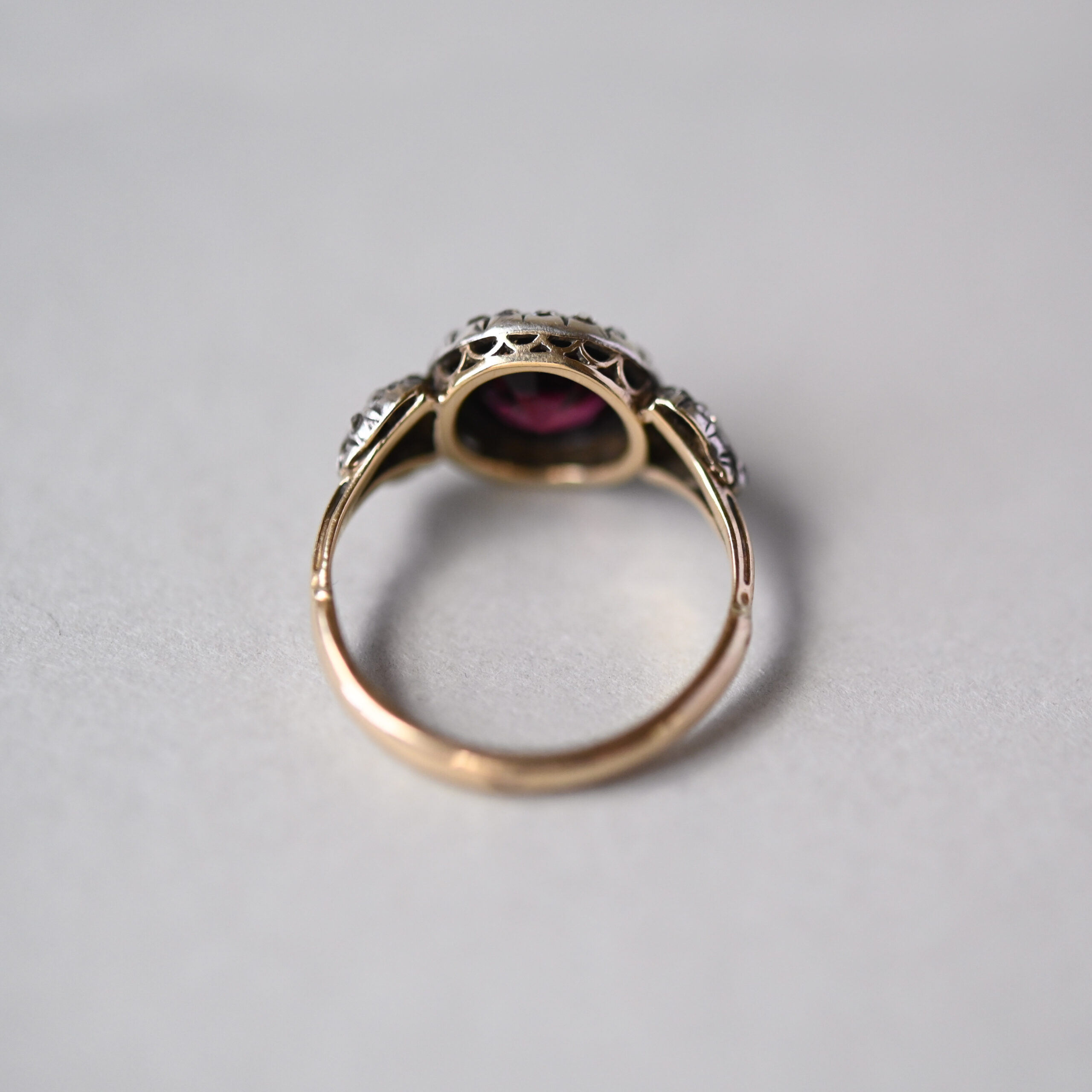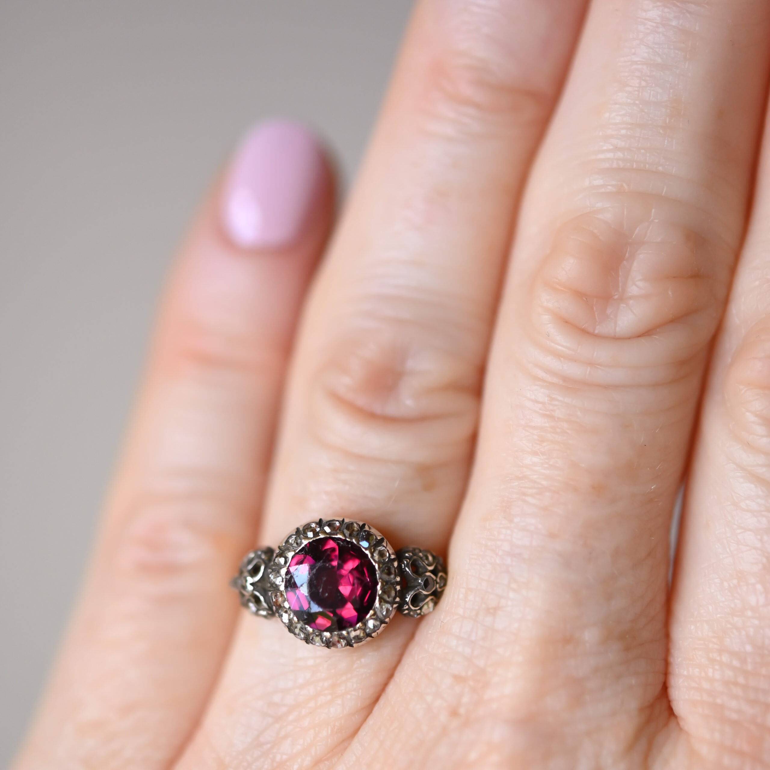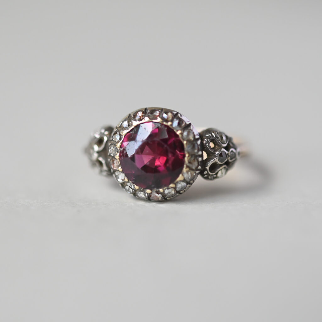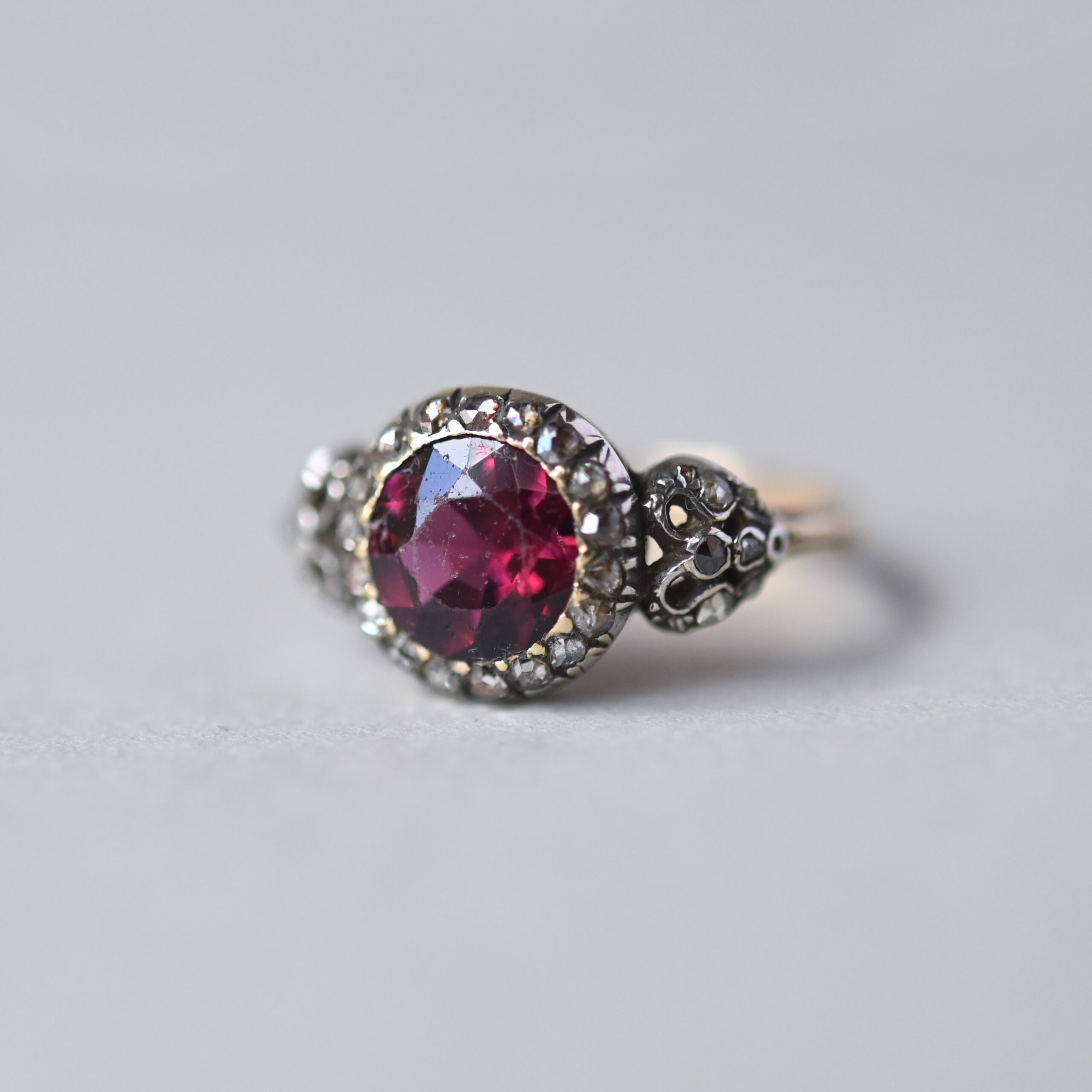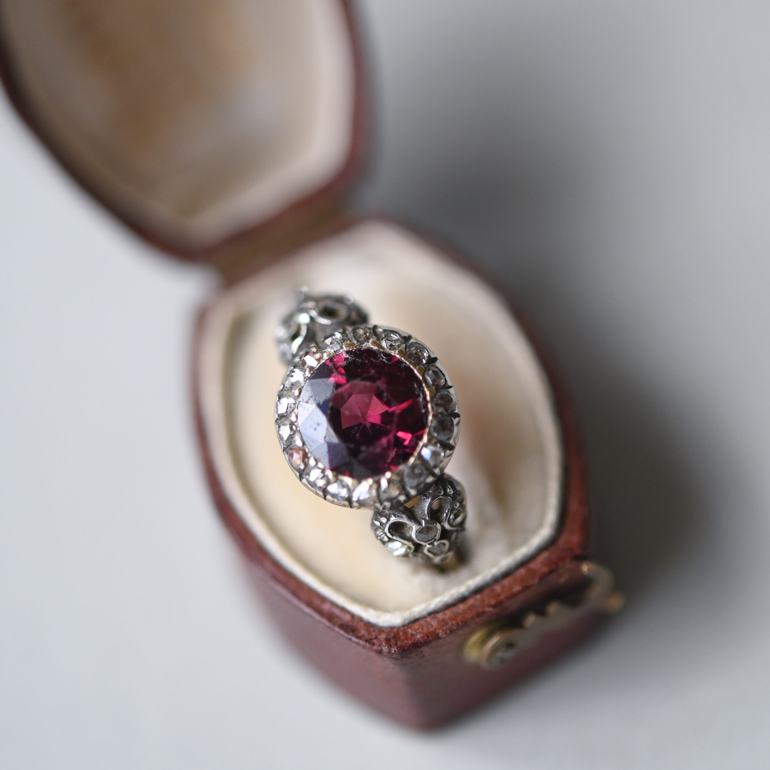 This exquisite antique English ring dates to first half of the 19th century, c.1840s, fitting neatly between the late Georgian and early Victorian eras. Set with a central round shaped garnet and a halo of mini rose cut diamonds. The garnet is a rich and delicious berry hue with a hint of plum. Measuring 7 mm in diameter and beautifully saturated. Surrounded by a halo of individually set twinkling diamonds, totalling an estimated 0.34 carats. Flanked by diamond set foliate and open detailed shoulders. The cluster measures 11 mm in diameter. A gorgeous 180 year old jewel that would make a perfect antique engagement ring. Offered in very good antique condition with a few minor nibbles to facet edges as would be expected. Please note the box shown is for demonstration purposes.