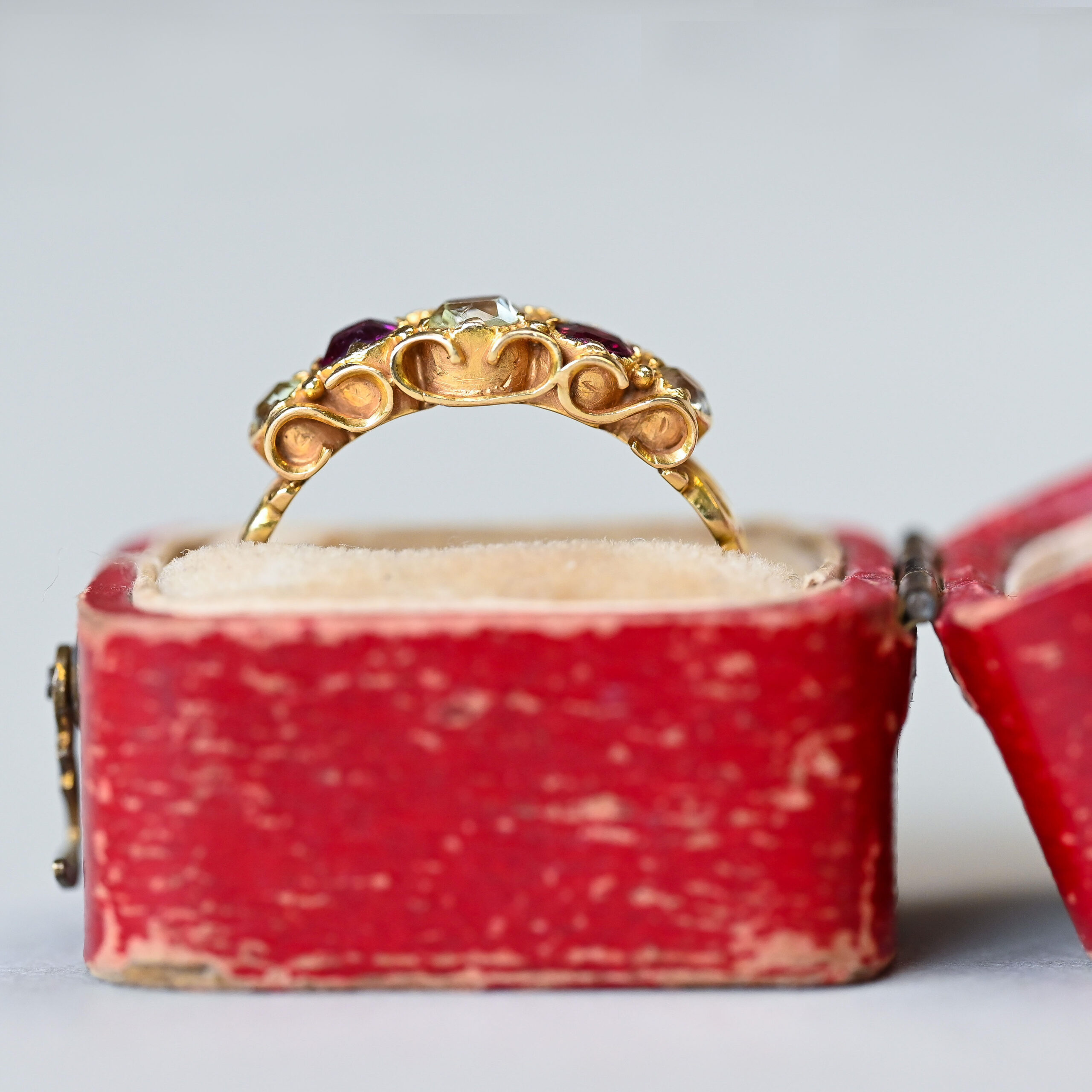 Dating to the 19th century, this beautiful antique 15ct gold five stone ring fits neatly into the Victorian era. Designed as a graduated five stone, set with facetted berry hue garnets and pale yellow topaz. The topaz are bright and display lovely open culets, resembling old cut diamonds. With a scroll detail gallery, an open back setting and a plain shank. A gorgeous example of antique English jewellery. Dates to c.1860s. Please note the boxes shown are for demonstration purposes.