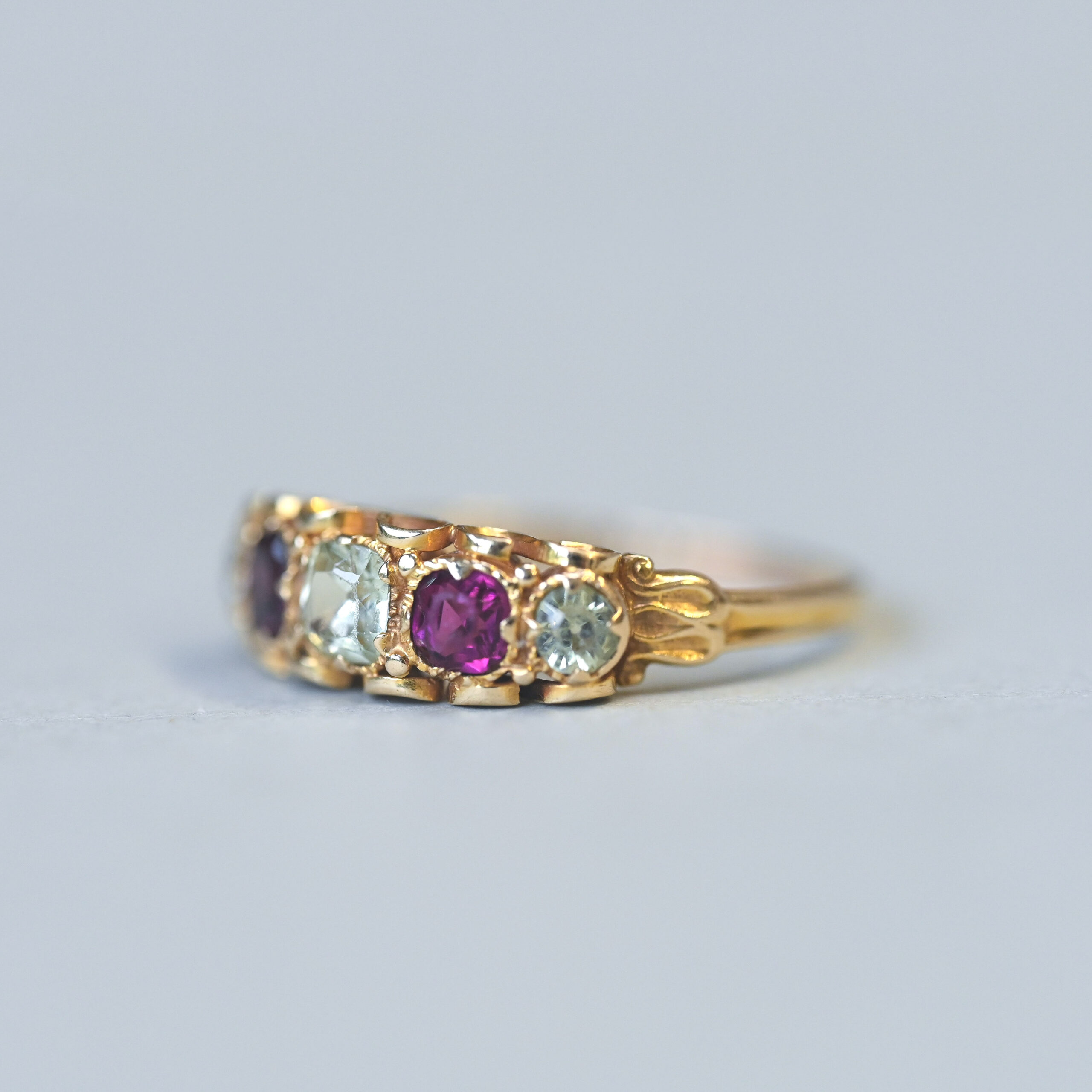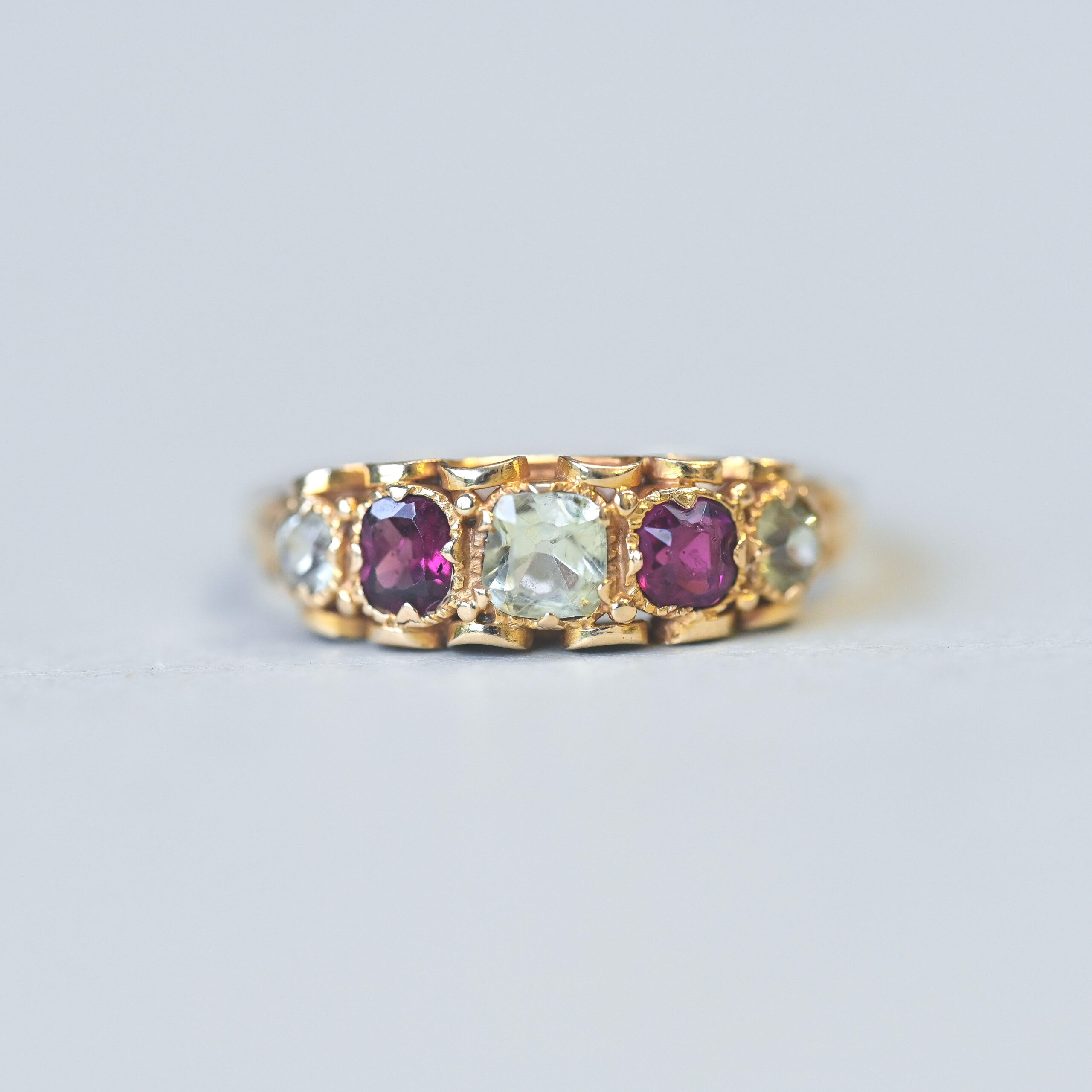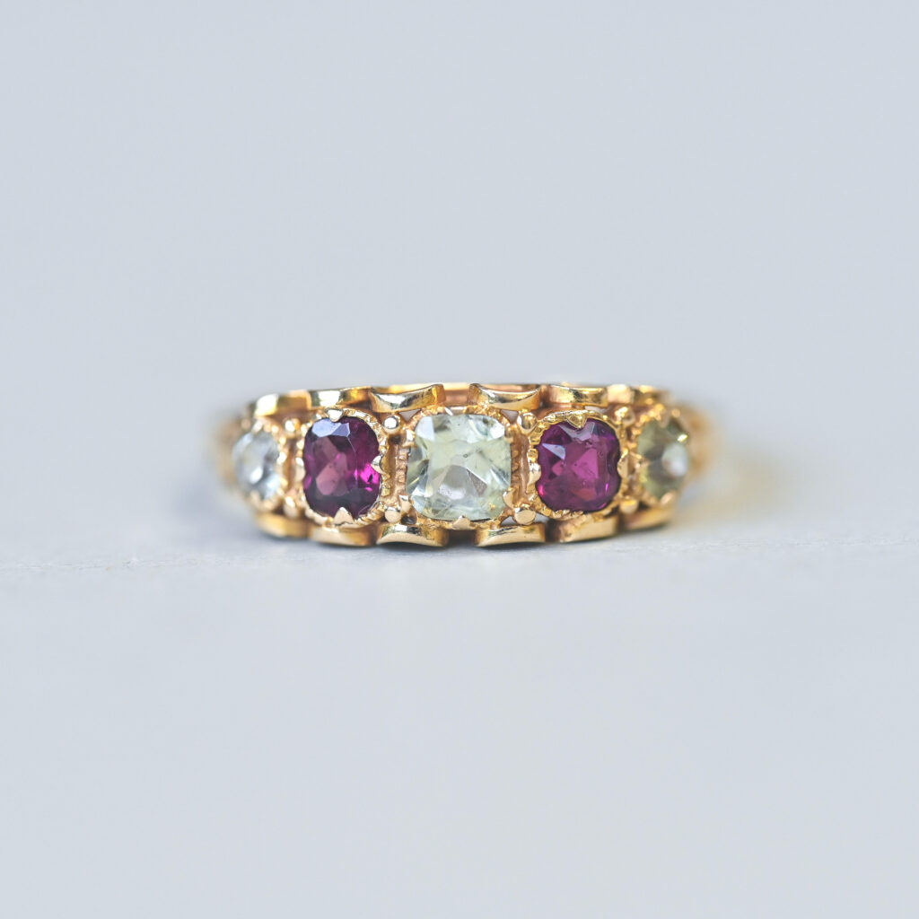 Victorian 15ct gold garnet and pale yellow topaz five stone ring. C.1860s