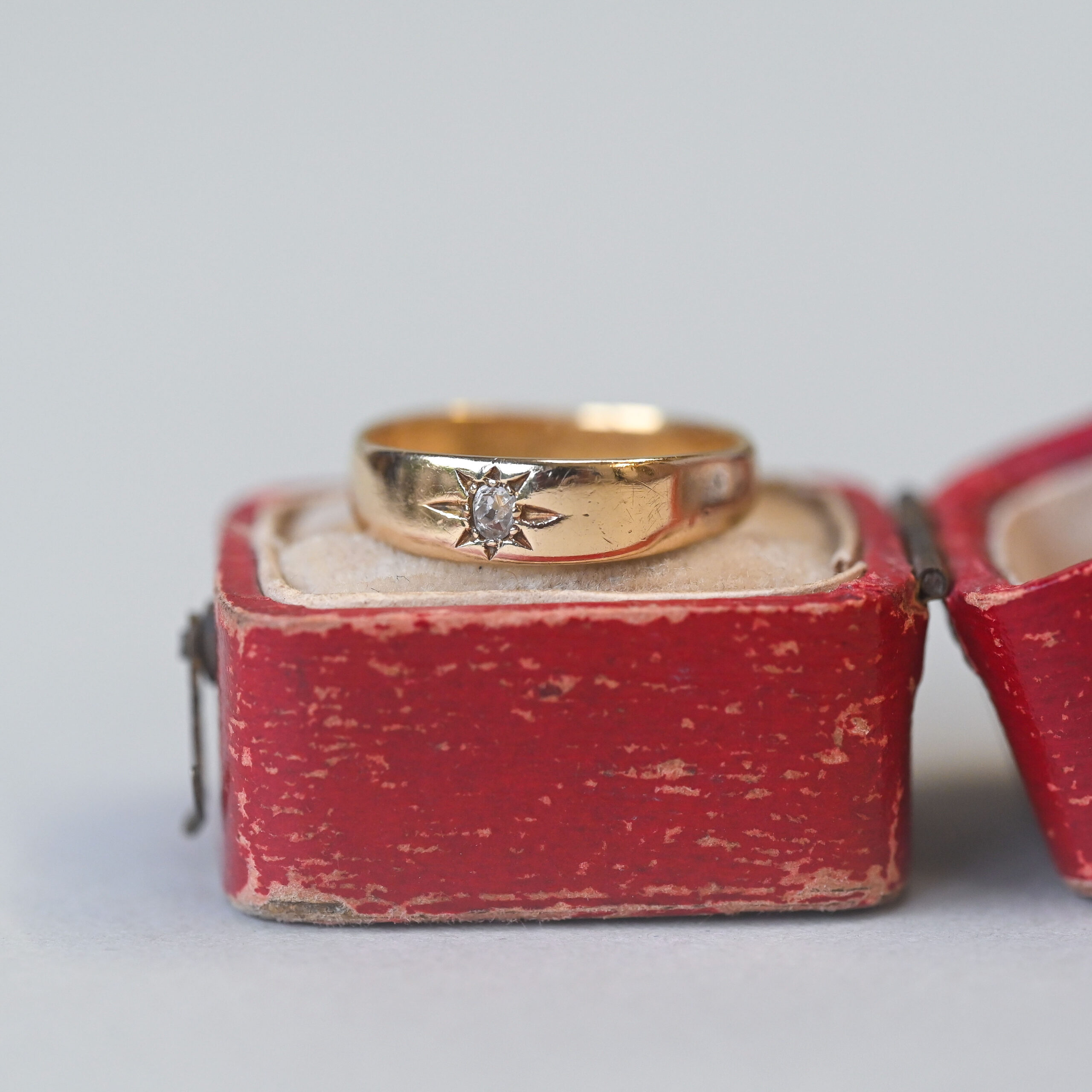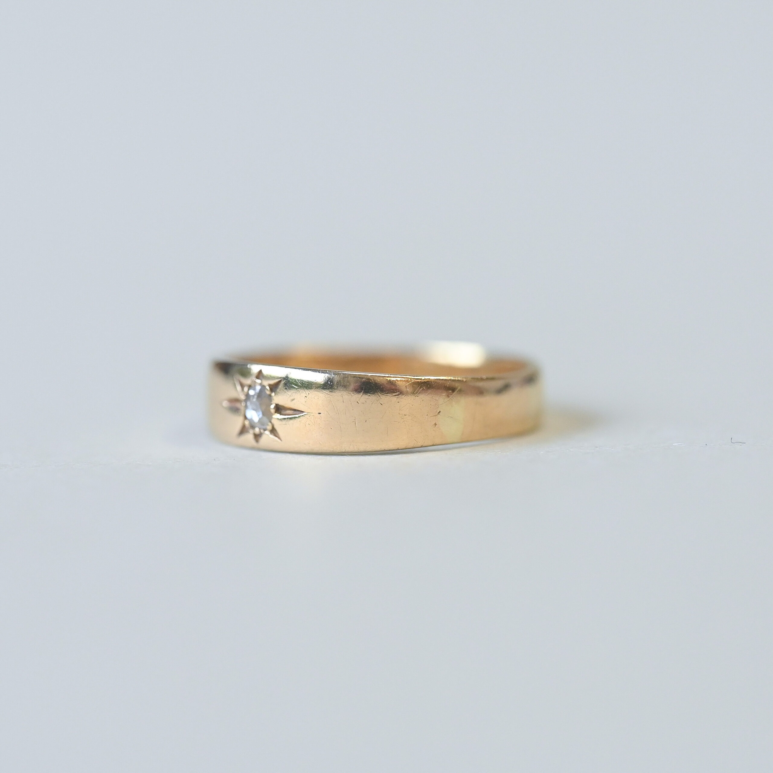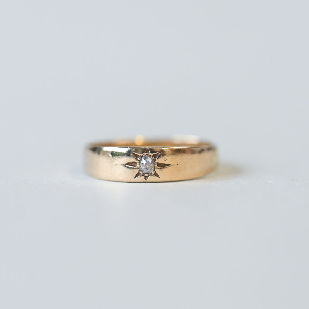 Dating to the turn of the 20th century, this sweet piece fits neatly into the late Victorian era, c.1900. Beautifully designed as a classic starburst band, set with a 0.08 carat old cut diamond. Please note the box shown is for demonstration purposes. A perfect piece to wear on its own or stack with others.