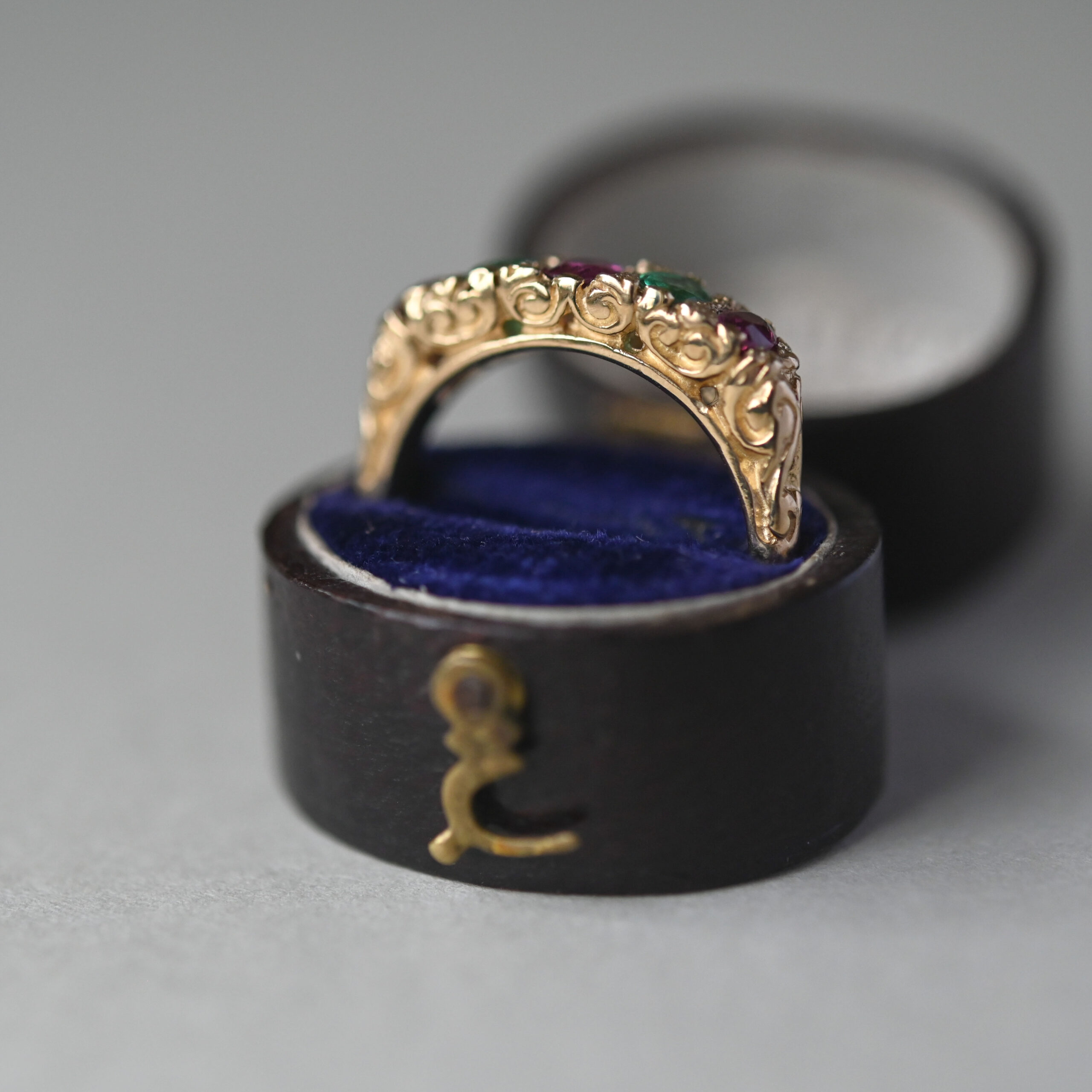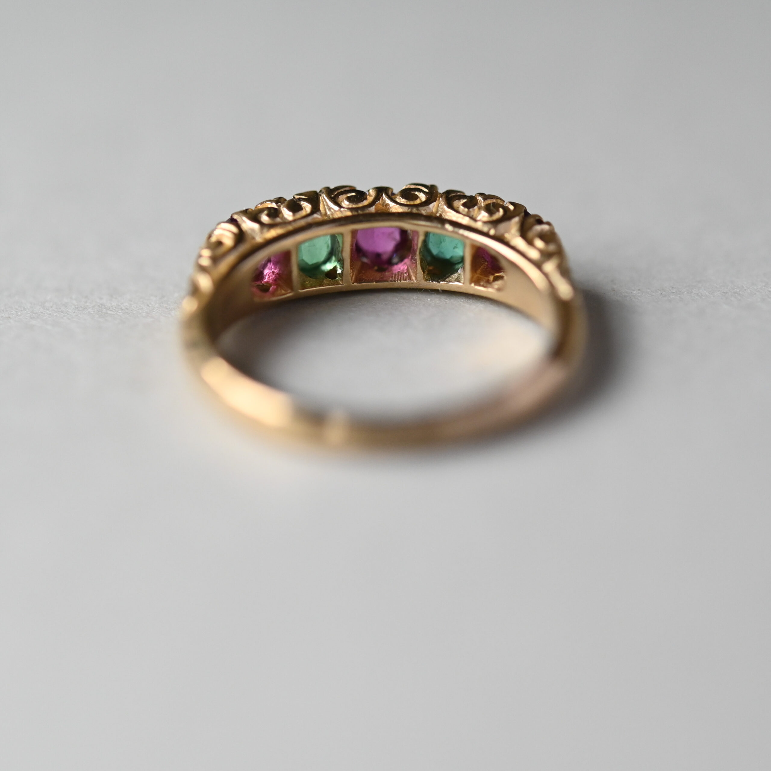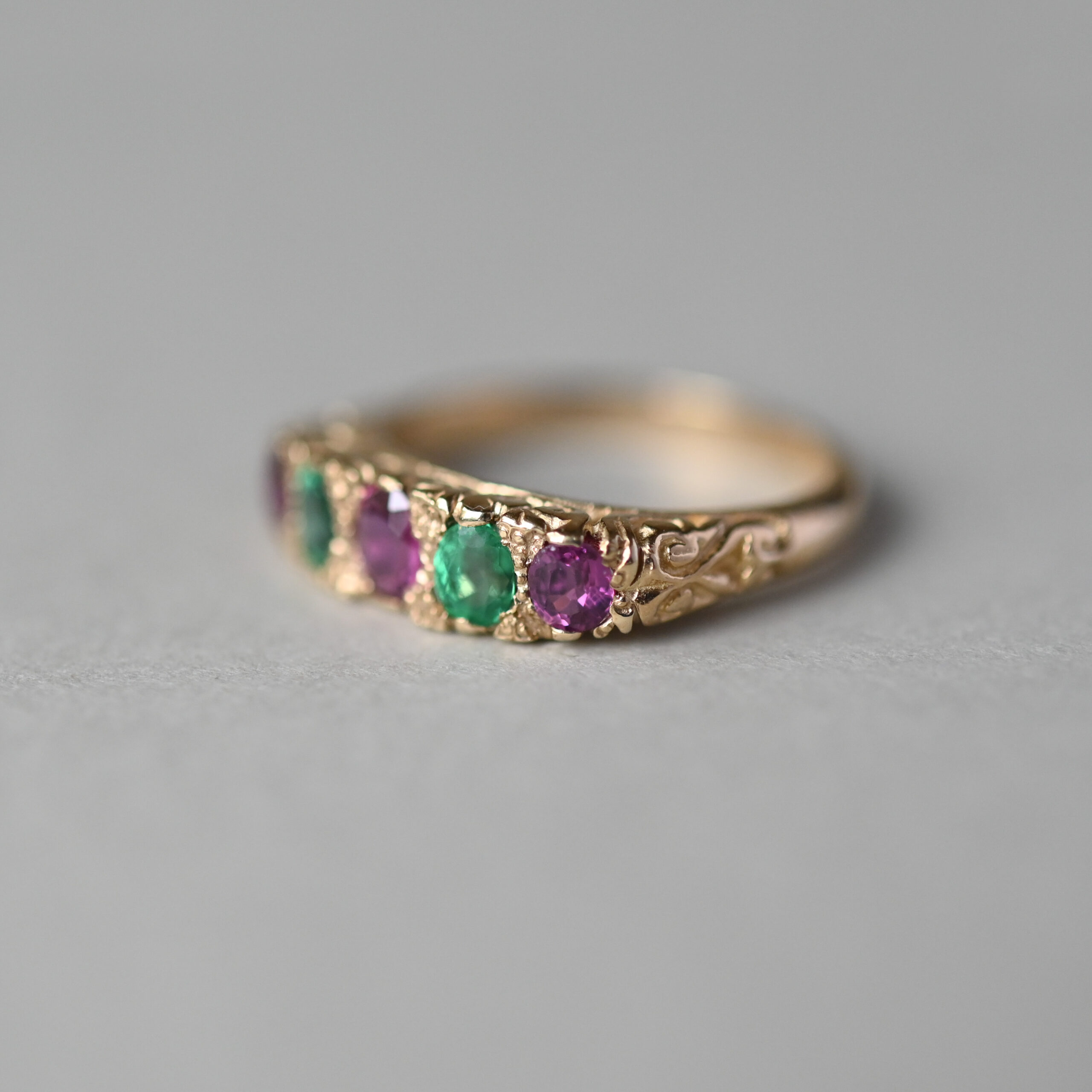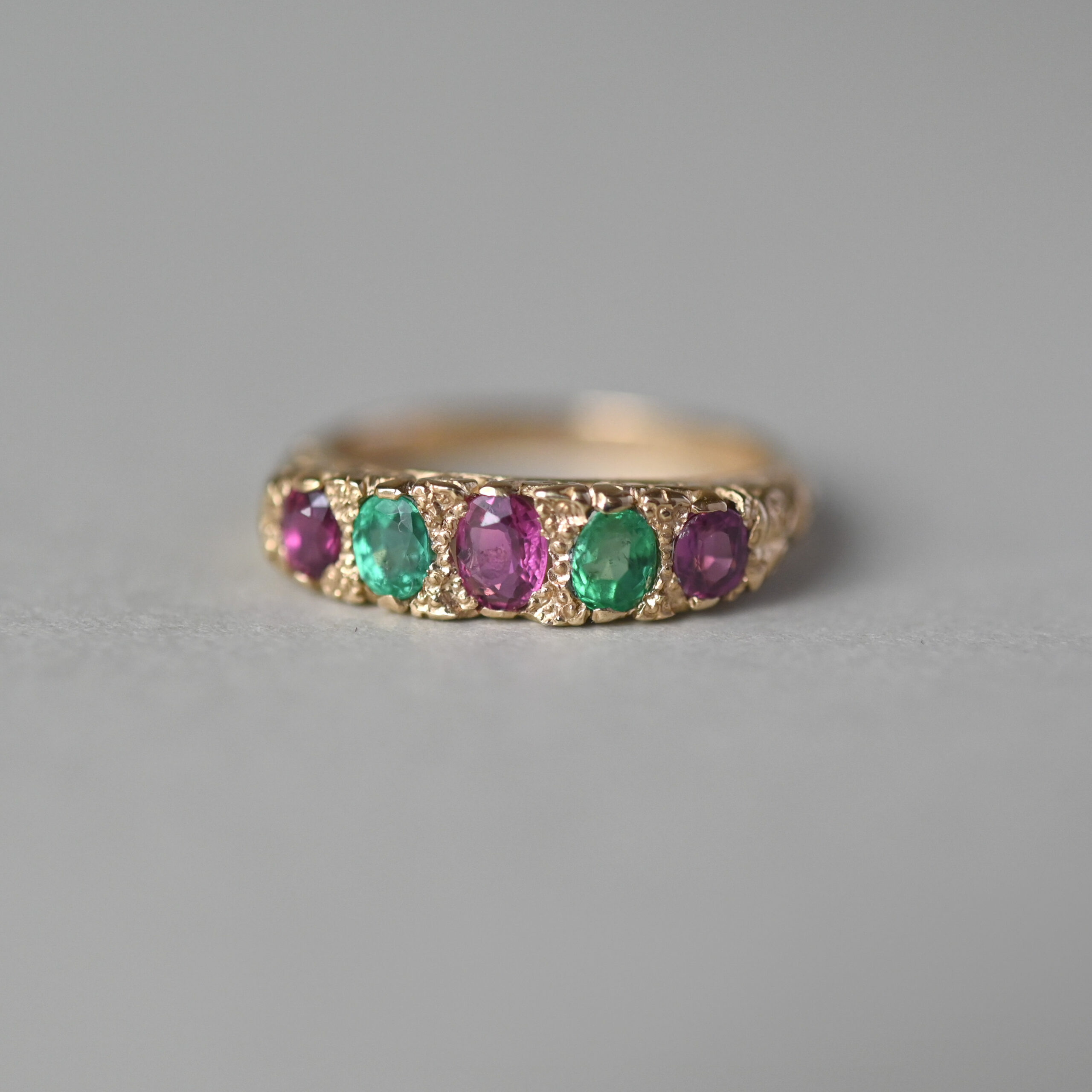 A beautifully designed contemporary 9ct gold ring that nods to Victorian aesthetics. Set with a visually pleasing graduated line of alternating red spinel and tsavorite in a traditional five stone design. The spinel are a rich berry hue and play beautifully in the light. The tsavorites are a gorgeous spring green and are well saturated. With a scroll detail gallery. Ring face measures 5 mm x 18 mm. Please note the box shown is for demonstration purposes. By maker E.F.Ltd. A perfect piece to wear on its own or stack with others.