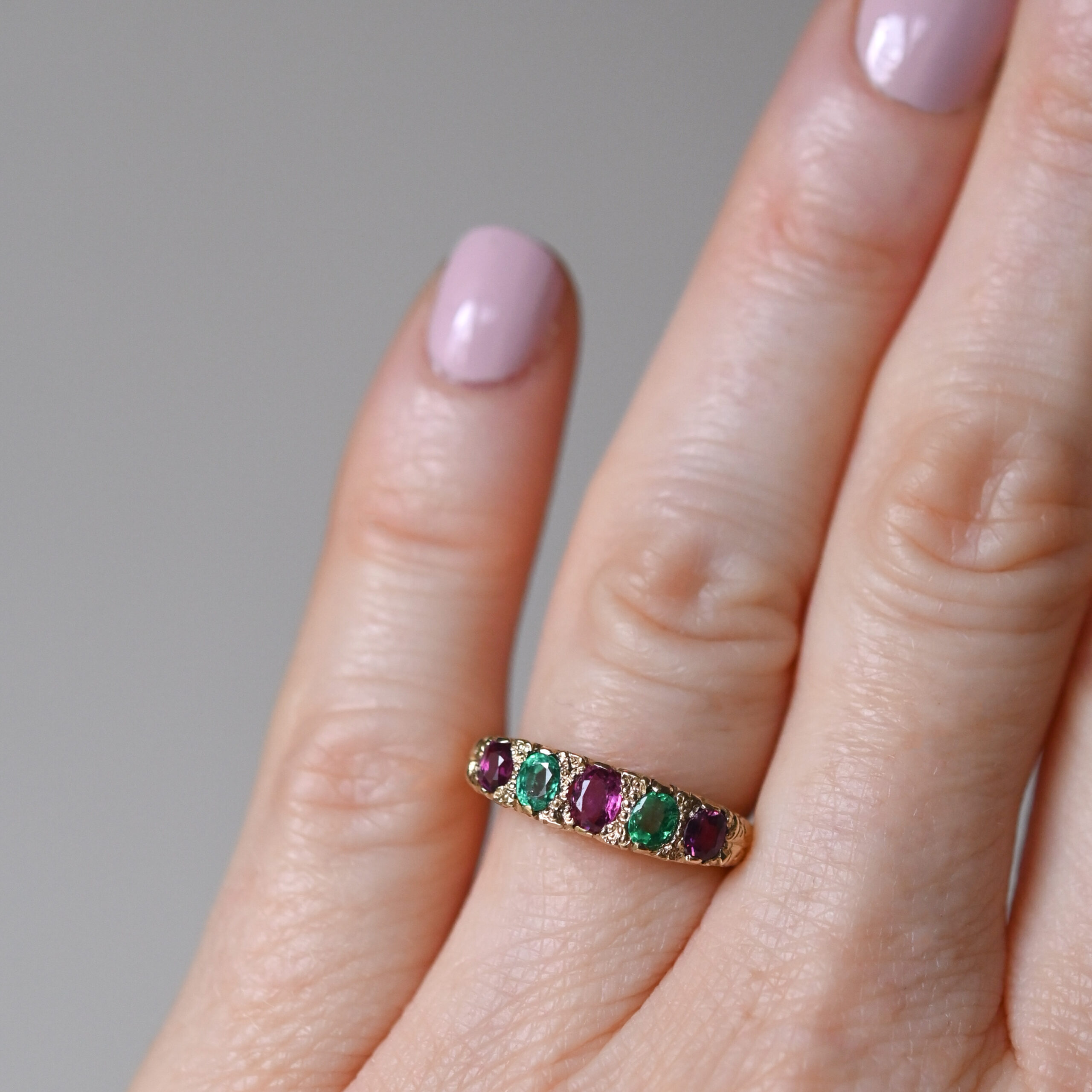 Victorian design 9ct gold red spinel and tsavorite five stone ring, 1991