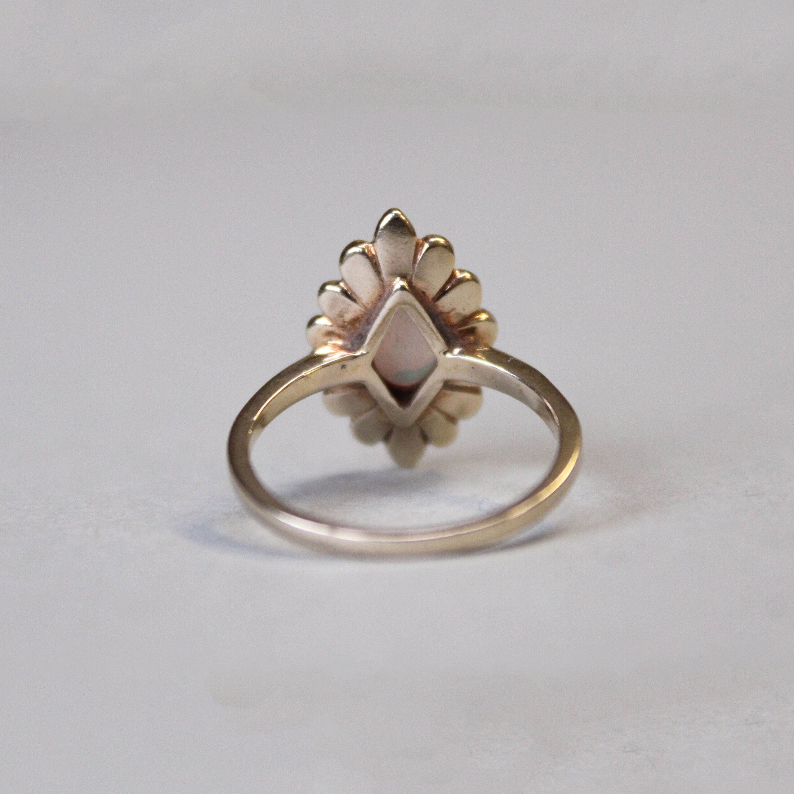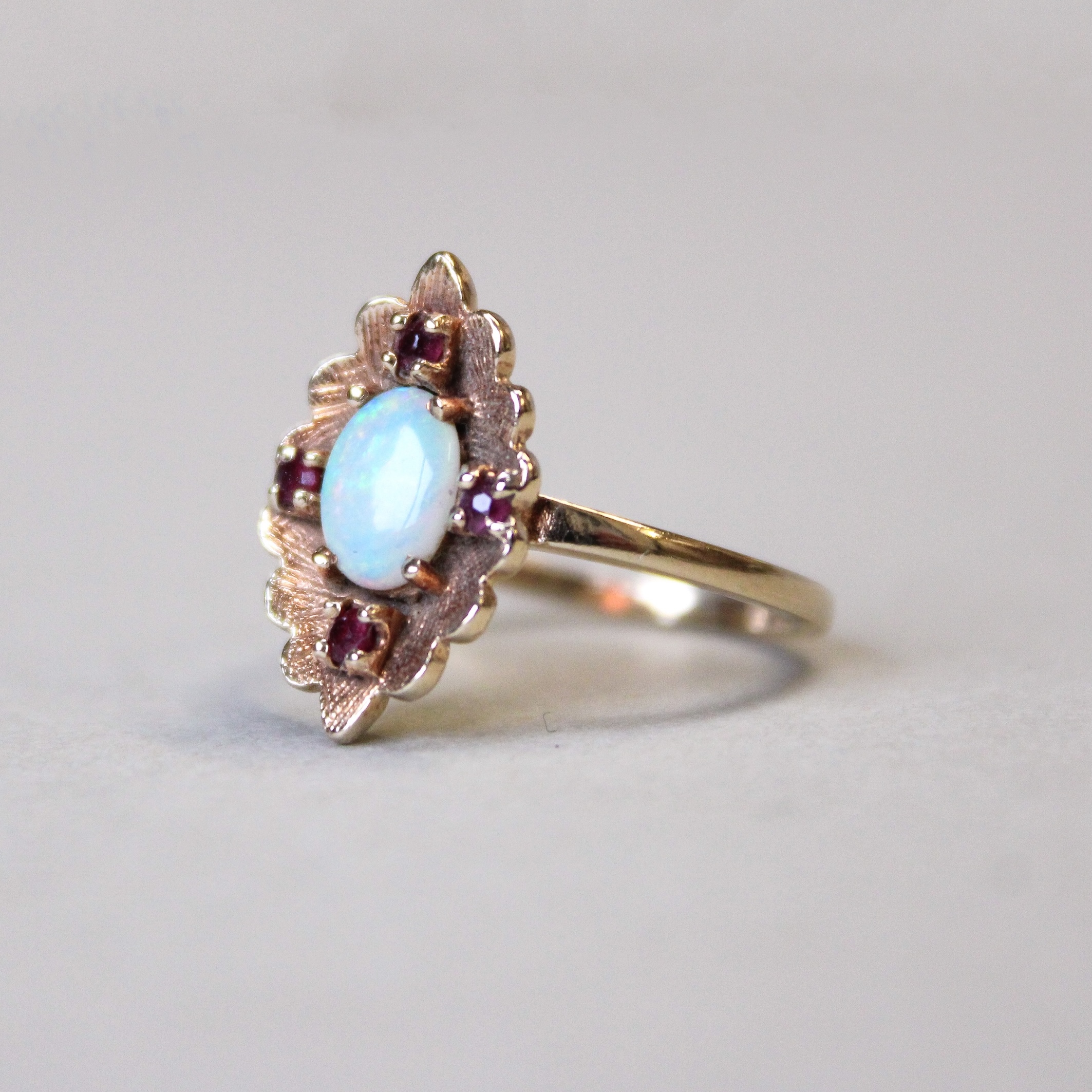 An aesthetically designed 9ct gold ring, claw set with a central oval-shaped opal. The opal shows a good play of colour and measures 7 mm x 5 mm. Highlighted with four round rubies to its sides, each measuring 2 mm x 2 mm. The ring face is a sweet, lightly textured, leaf shape with a gently scalloped edging. Face measures 18 x 11 mm. On a plain shank. Dates to the c.1970s – 1980s.