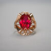 An aesthetic vintage 14ct gold synthetic ruby ring dating to the mid 20th century. Gorgeously designed with two 13 mm x 4 mm electric pink synthetic marquise shape rubies. Set side by side, the design is reminiscent of a lightning bolt. With ball finial twist details and a grooved shank. Ring face measures 16 mm x 14 mm.