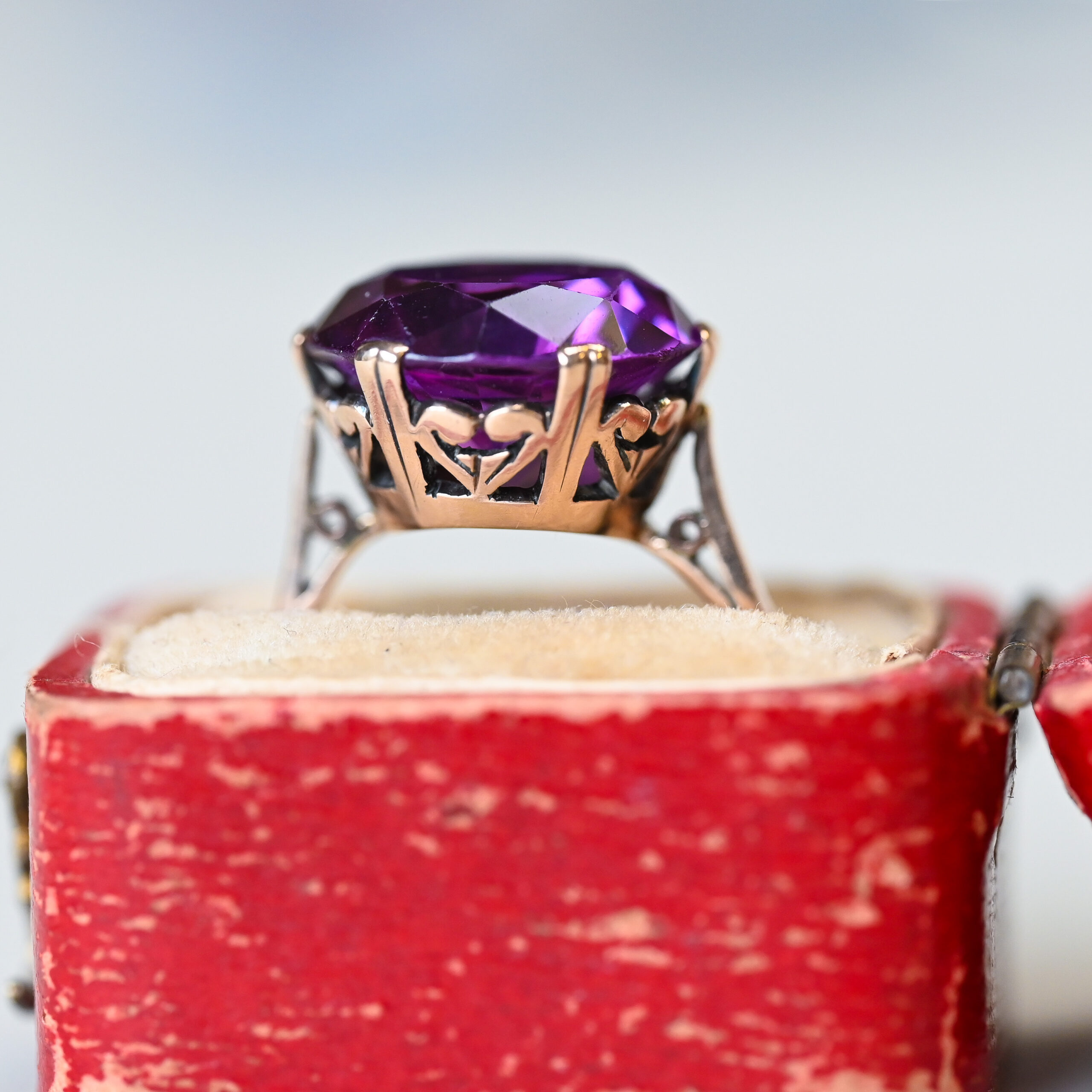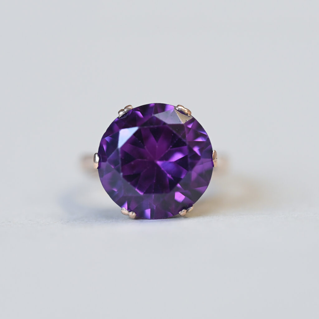 Dating to the c.1960s, this aesthetic piece is simultaneously beautiful and fascinating. Claw set with a central round colour change sapphire. The sapphire is synthetic, meaning it is a real gemstone made under laboratory conditions. The sapphire’s colour is warm reddish purple and changes to a cool violet blue depending on the light source, either natural day light or incandescent light. The sapphire measures 13 mm in diameter. With a scrolling open heart style setting. On a plain shank. Please note the box shown is for demonstration purposes.