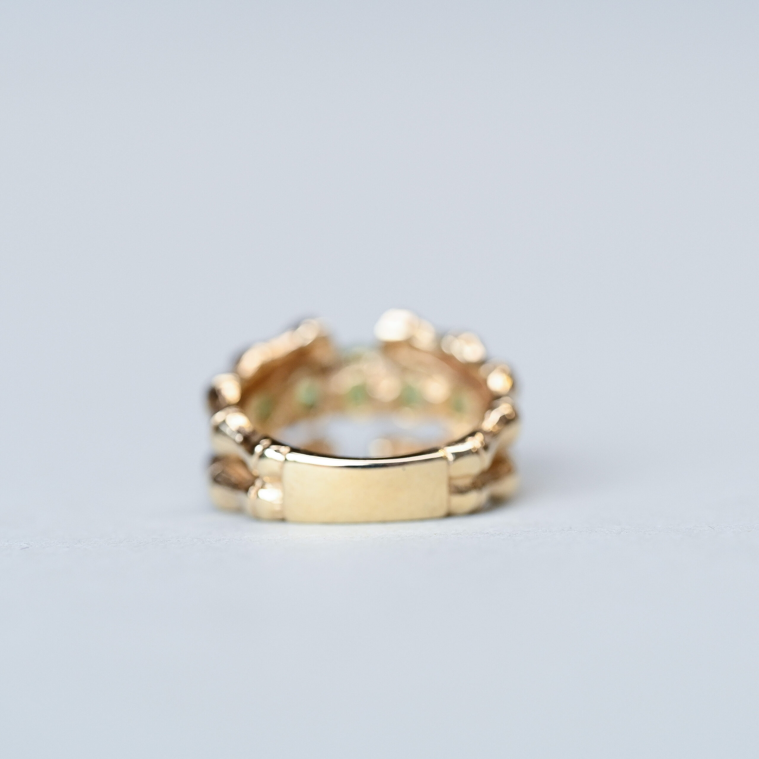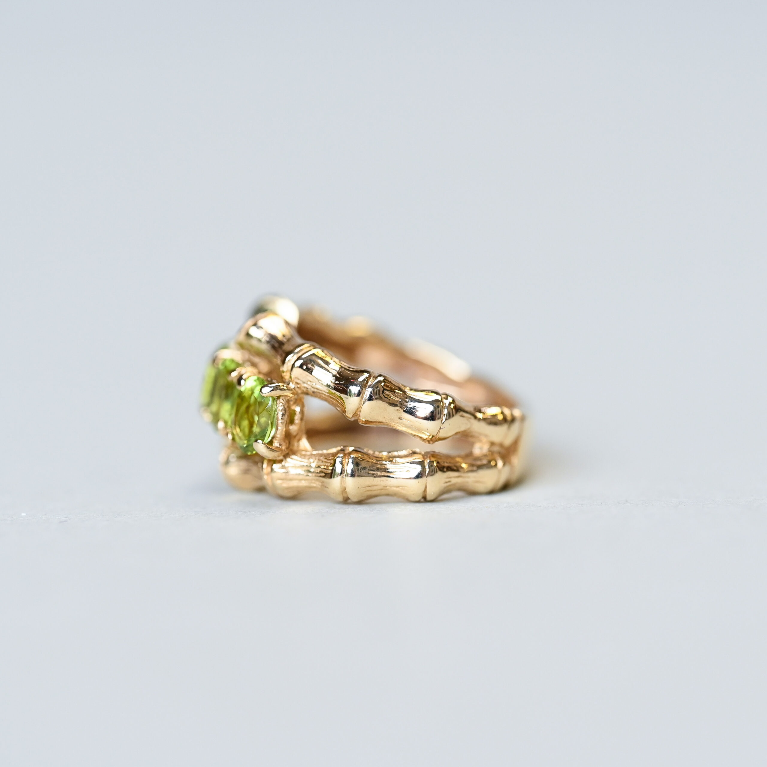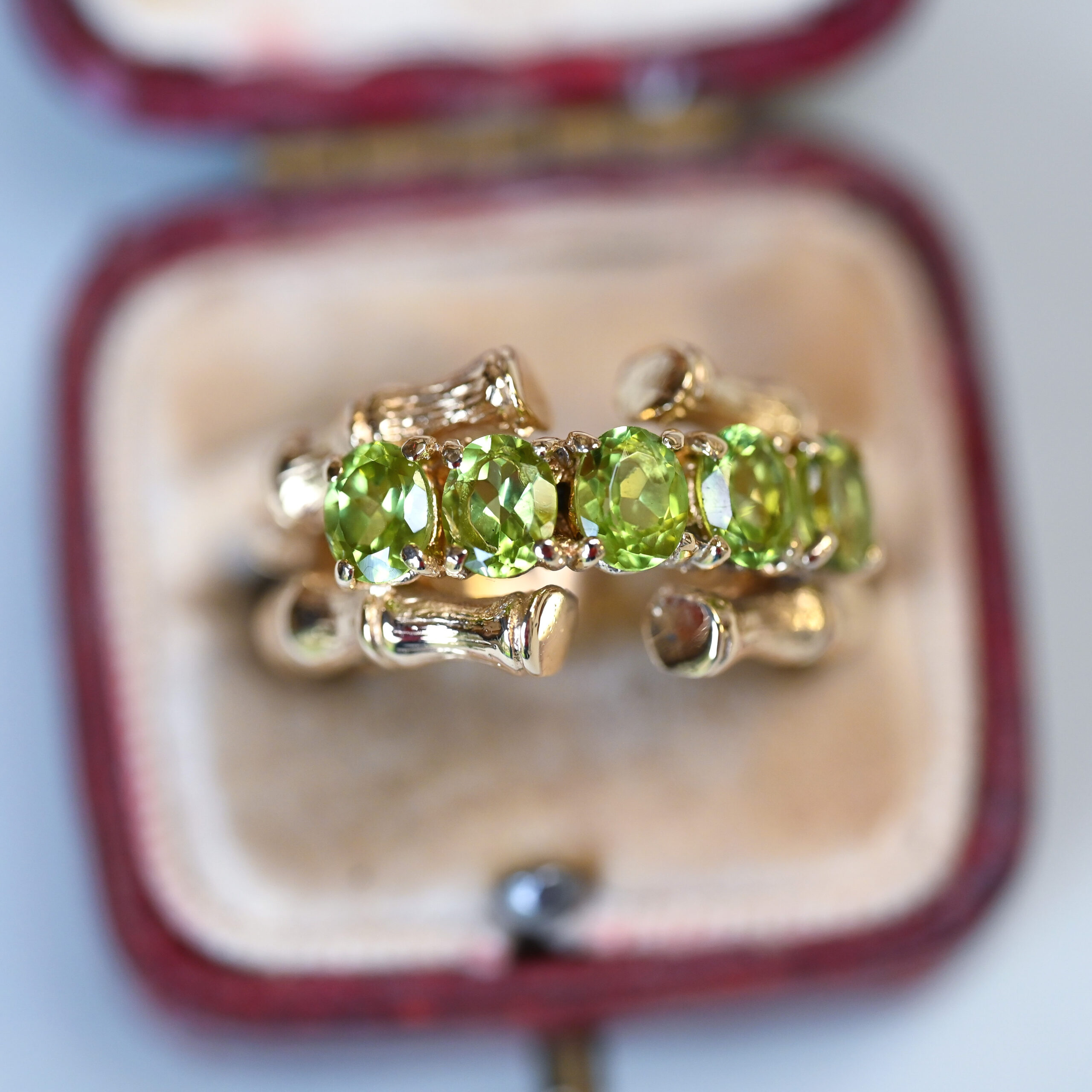 Dating to the c.1970s – 1980s, this aesthetic piece is a gorgeous example of vintage bamboo jewellery design. Set with a line of oval cut peridot in a textured split bamboo setting. The peridot are a fresh spring green hue with a delicious hint of apple, each measuring 4 mm x 3 mm. The peridot have been recently replaced by my jeweller. The ring face measures 16 mm x 22 mm, on a tapered shank. Please note the box shown is for demonstration purposes.